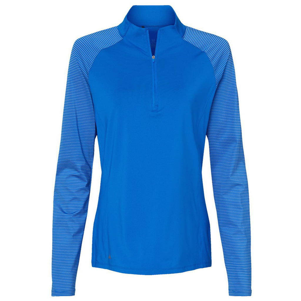 Adidas Women's Glory Blue Stripe Block Quarter-Zip Pullover with a corporate logo is a fun way to showcase your company or brand while promoting a healthy lifestyle. This sleek pullover offers moisture-management properties, UPF 50+ protection, and a self-mock collar so you can enjoy a morning jog, play a game of tennis, or hit the gym in style.This product cannot ship outside of the United States