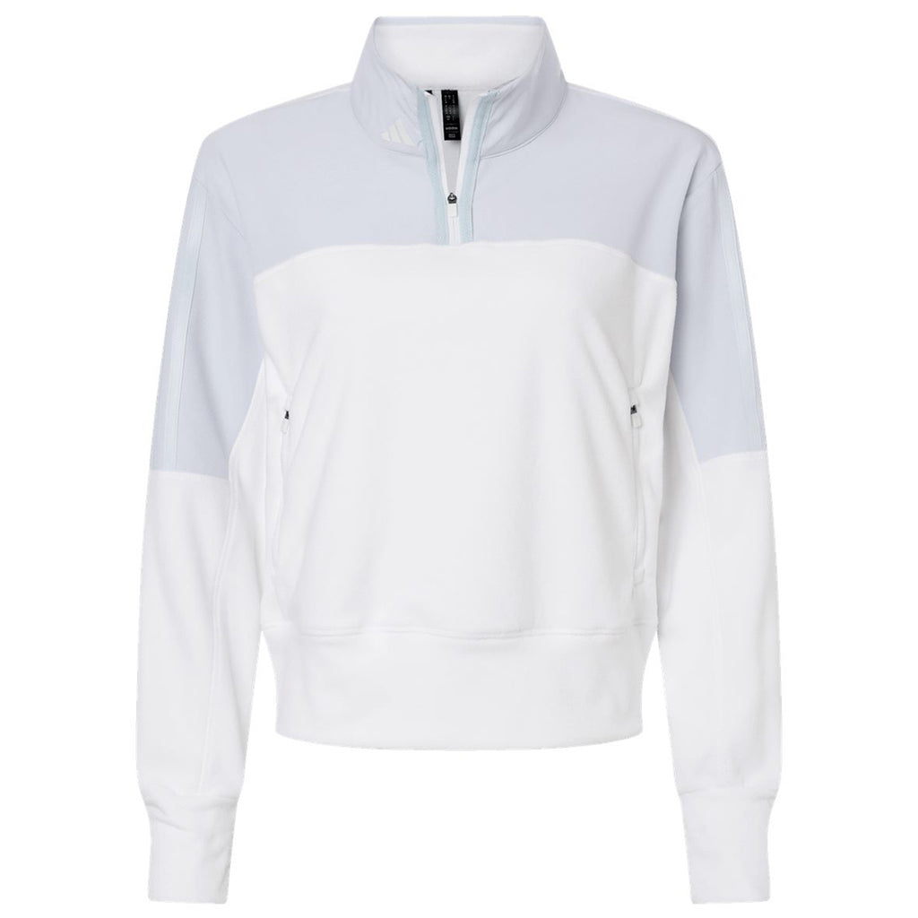 Adidas Women's Halo Blue Fleece Quarter Zip Pullover with a custom design is a must-have for those who like a lightweight fleece that looks and feels stylish. The sleek look of this fleece allows the wearer to create an overall look without the bulk while maintaining warmth. Perfect for golf, tennis, or hanging out with friends.