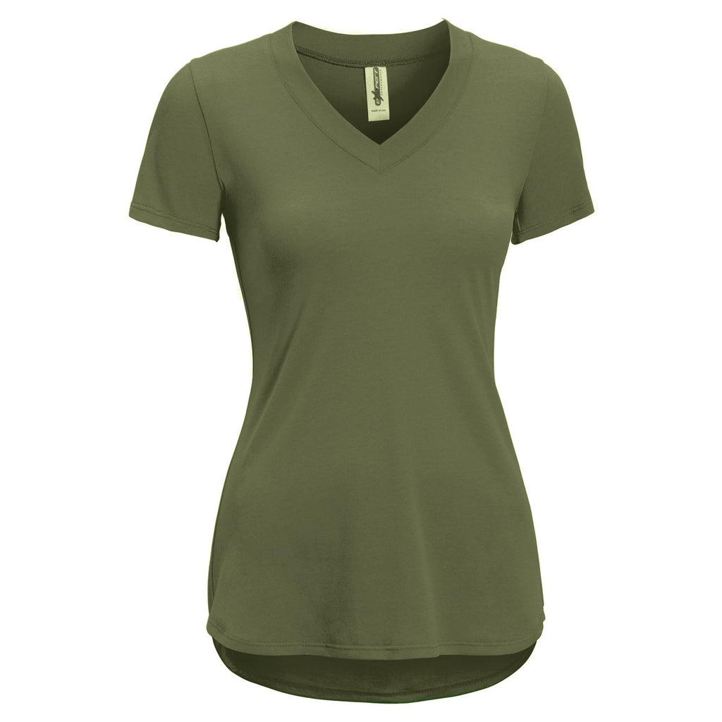 Expert's Expert Women's Military Green TriTec Deep V-Neck Tee takes a modern twist with host of workout-ready features for active days including a steep neck, drop hem for extra coverage and a modern form that lends a flattering, feminine fit. Soft tri-blend cotton-blend fabric ensures this top while being breathable and functional, is ready for sunny days of play in warm weather. Make your own workout tees for your event or company with our high-tech customization service allowing you to add your logo imprint to this women's v-neck t-shirt.The minimum order for this product is 12 pieces.