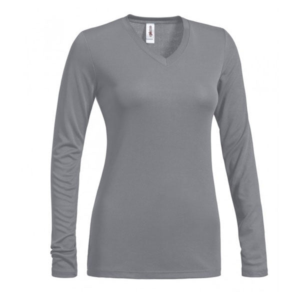 Expert Women's Steel V-Neck Long Sleeve Tee is a superb summer activewear essential. Its classic v-cut neckline adds to cool athletic style and makes for superior breathability. It's breathable and super-comfortable and wicks away sweat cooling you down during cardio or Zumba, and its stretchiness allows you to easily move around. Crafted from 100% microfiber polyester pk maX. Suitable for any sport, this full-sleeve women's t-shirt is customizable with your company's logo for corporate branding or giveaway swag.The minimum order for this product is 12 pieces.