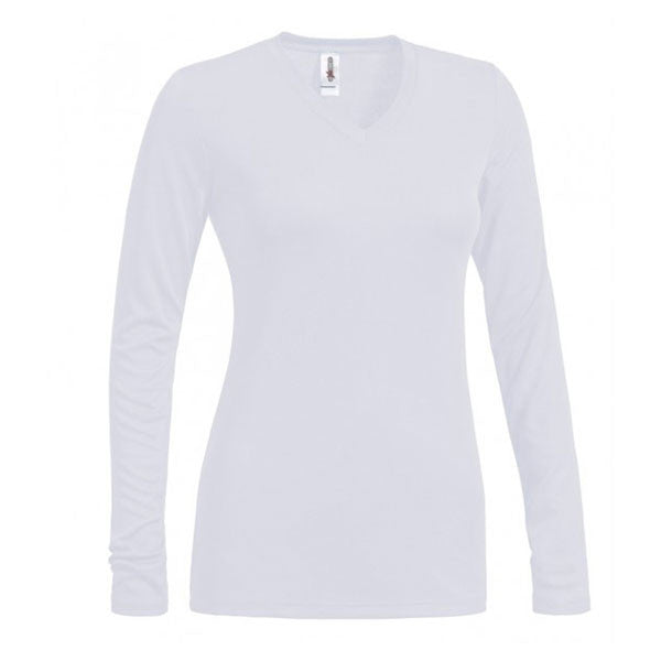 Expert Women's White V-Neck Long Sleeve Tee is a superb summer activewear essential. Its classic v-cut neckline adds to cool athletic style and makes for superior breathability. It's breathable and super-comfortable and wicks away sweat cooling you down during cardio or Zumba, and its stretchiness allows you to easily move around. Crafted from 100% microfiber polyester pk maX. Suitable for any sport, this full-sleeve women's t-shirt is customizable with your company's logo for corporate branding or giveaway swag.The minimum order for this product is 12 pieces.