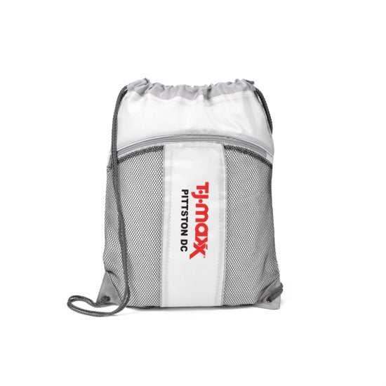 • 210D polyester, two tone mesh and nylon drawstring bag with front zippered pocket