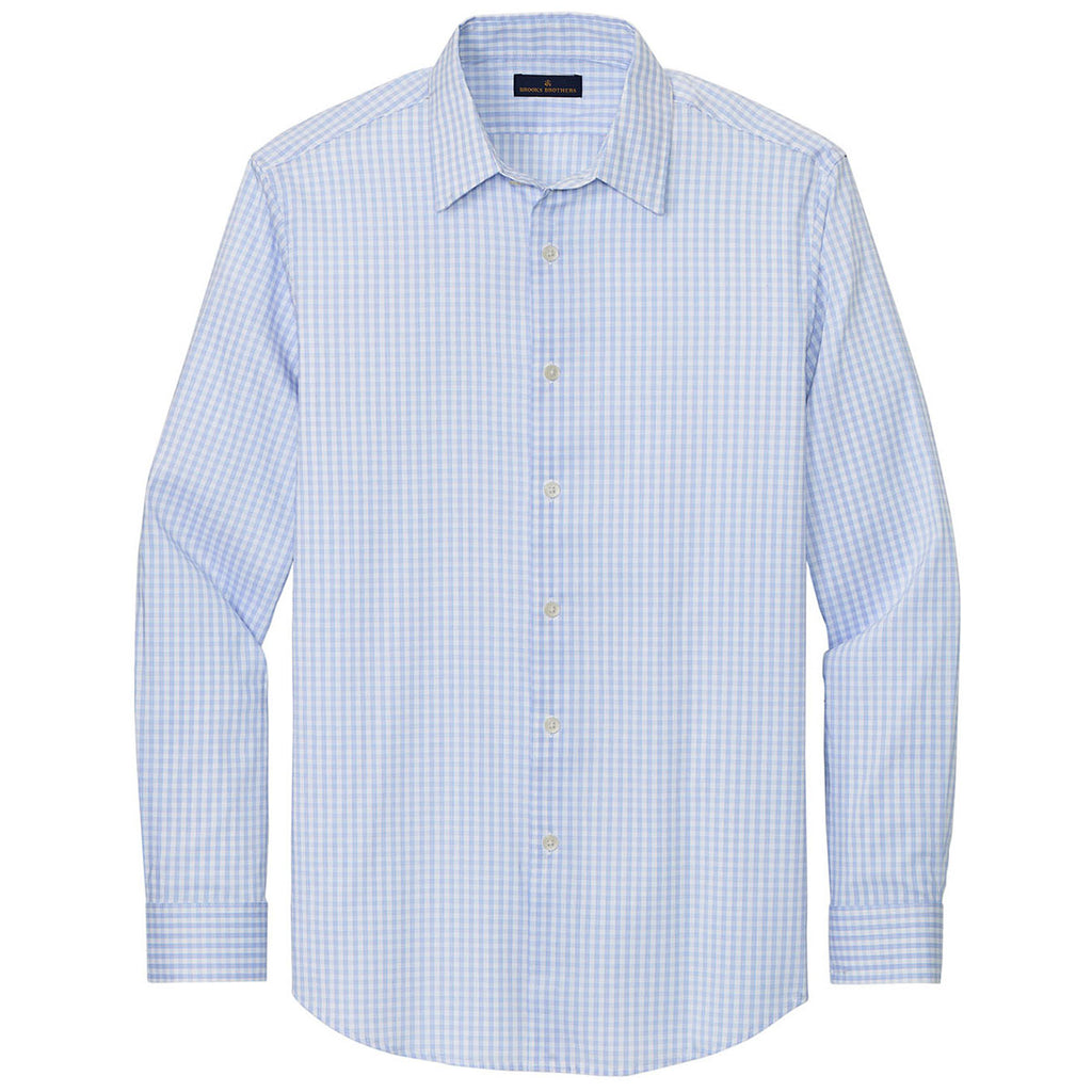 Brooks Brothers Men's Newport Blue/Pearl Pink Fine Check Tech Stretch Patterned Shirt with a custom logo will turn heads with the large checkered pattern that is sleek and stylish. The lightweight button-down is ideal for the office with a button-down collar, and adjustable cuffs. Great piece to complete any outfit. This is a must-have for every corporate wardrobe. Place an order today.