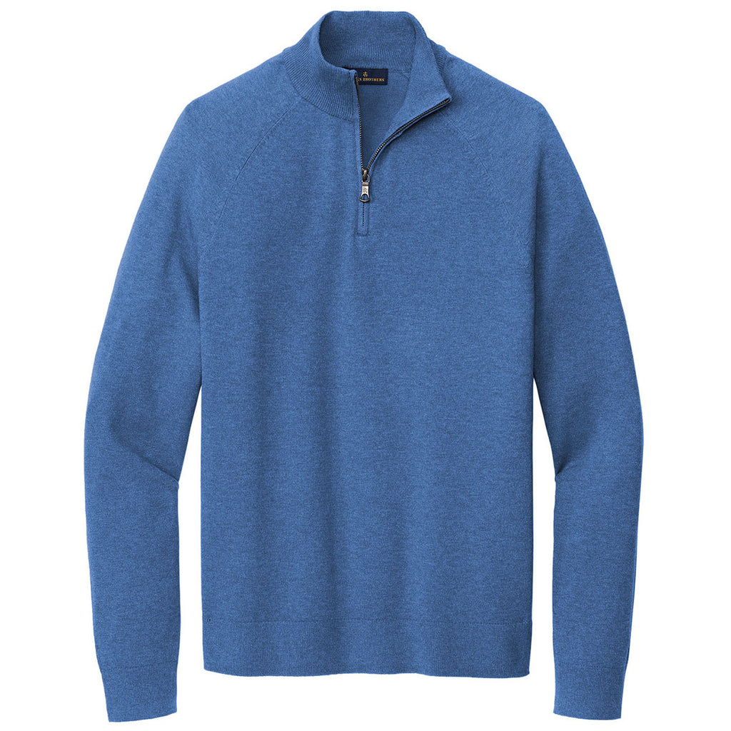 Choose your embroidery for the Brooks Brothers Men's Charter Blue Heather Cotton Stretch Quarter Zip Sweater for a custom look that is ready for your busy schedule. The raglan sleeves and custom zipper pull add flair to the handsome sweater that is easy to layer when the days get chilly. Pair with a button-down for the office or a tee for autumn fun. Add your company logo, custom design, or an embroidered name for personalization. Order today.