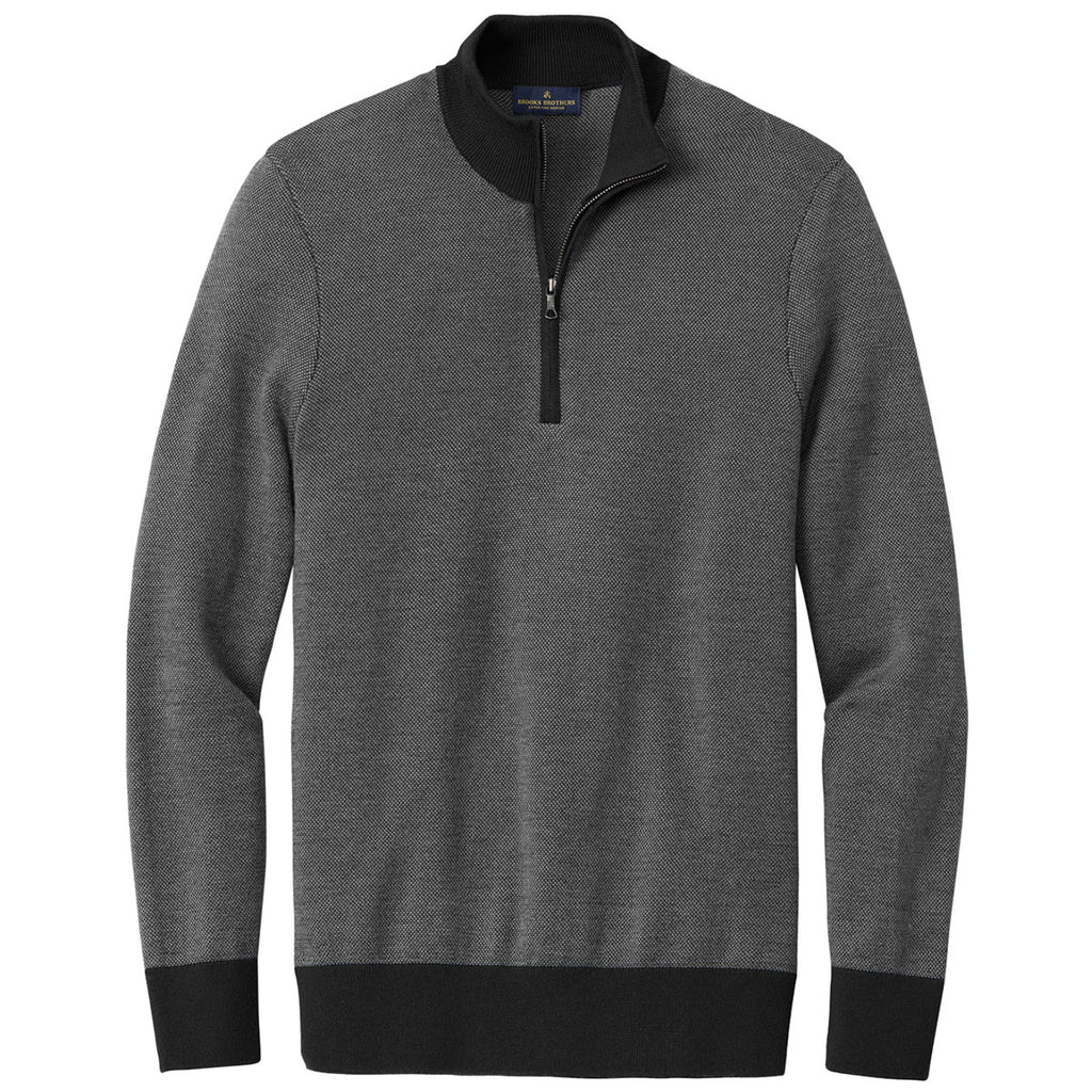 Add a custom logo to the Brooks Brothers Men's Deep Black/Shadow Grey Washable Merino Birdseye 1/4 Zip Sweater to create an upscale look that will turn heads. Made of extra-fine merino wool, the machine washable sweater has a cadet collar and antique silver zipper pull. Great for work, golfing, tennis, or hanging out with friends. Place an order today.This product cannot ship outside of the United States.