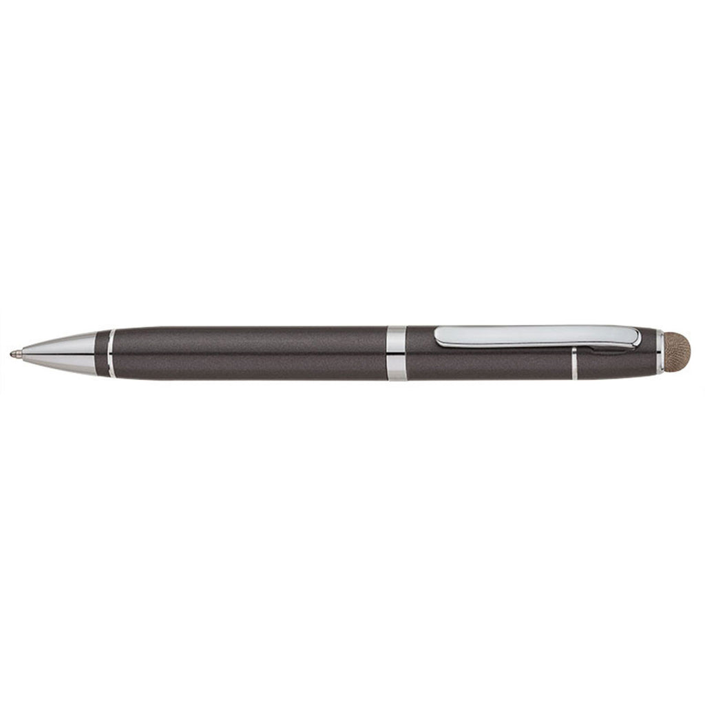 Register your next noble idea with Logomark Conductor Grey Pen + Stylus. Featuring a twist-action mechanism for solid strokes and rich ink. It has a conductive stylus you can use on your touch-screen devices. Impress your employees and clients by custom Conductor pens imprinted with your company logo.