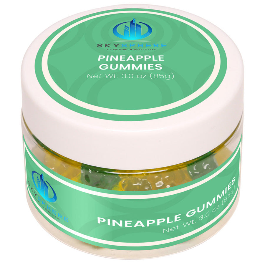 SugarSpot Clear Pineapple Gummies: Small Jar with a custom logo will remind you of the tropics with the sweet, juicy, tropical candies that can be shared. Add a date and name to giveaway at a luau or tropical theme event like prom and watch as people enjoy the memory and a snack. Place an order right away so you do not miss out on this special treat.The minimum order for this product is 25 pieces.