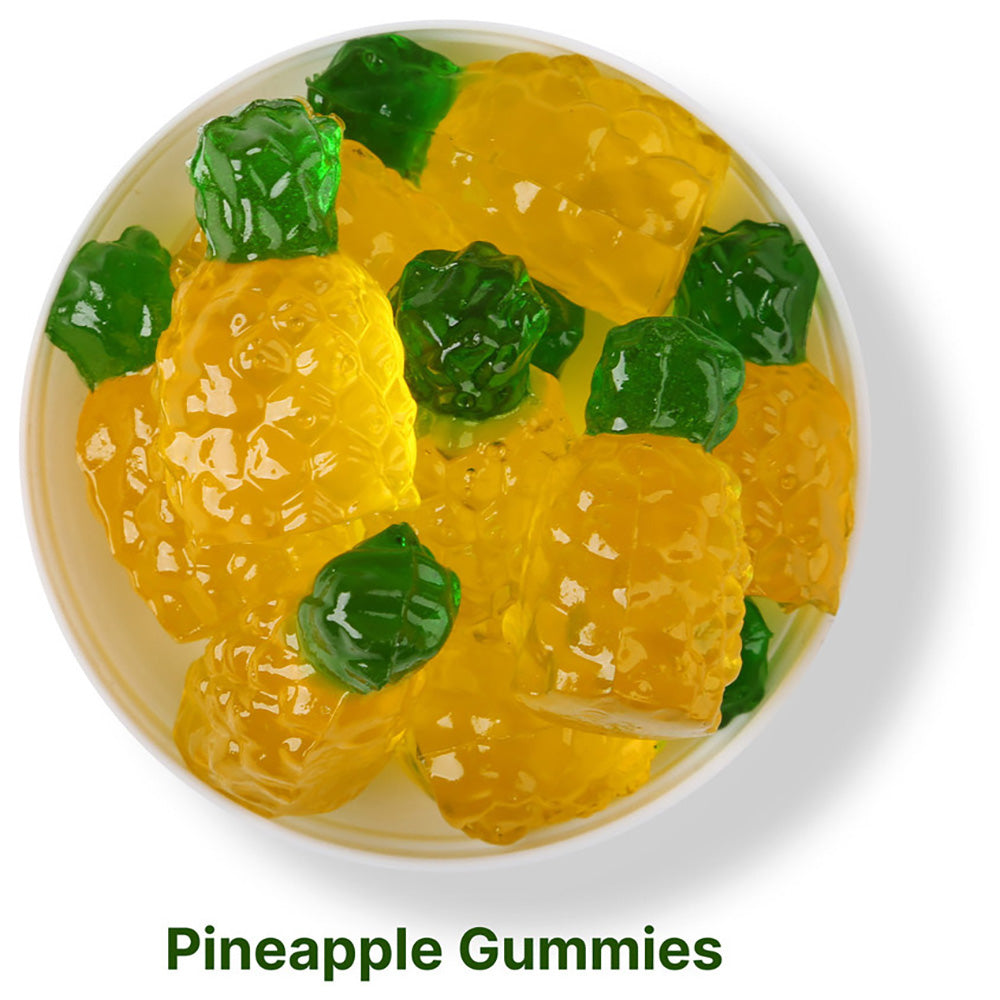 - 3D pineapple-shaped gummies with a juicy, sweet pineapple flavor