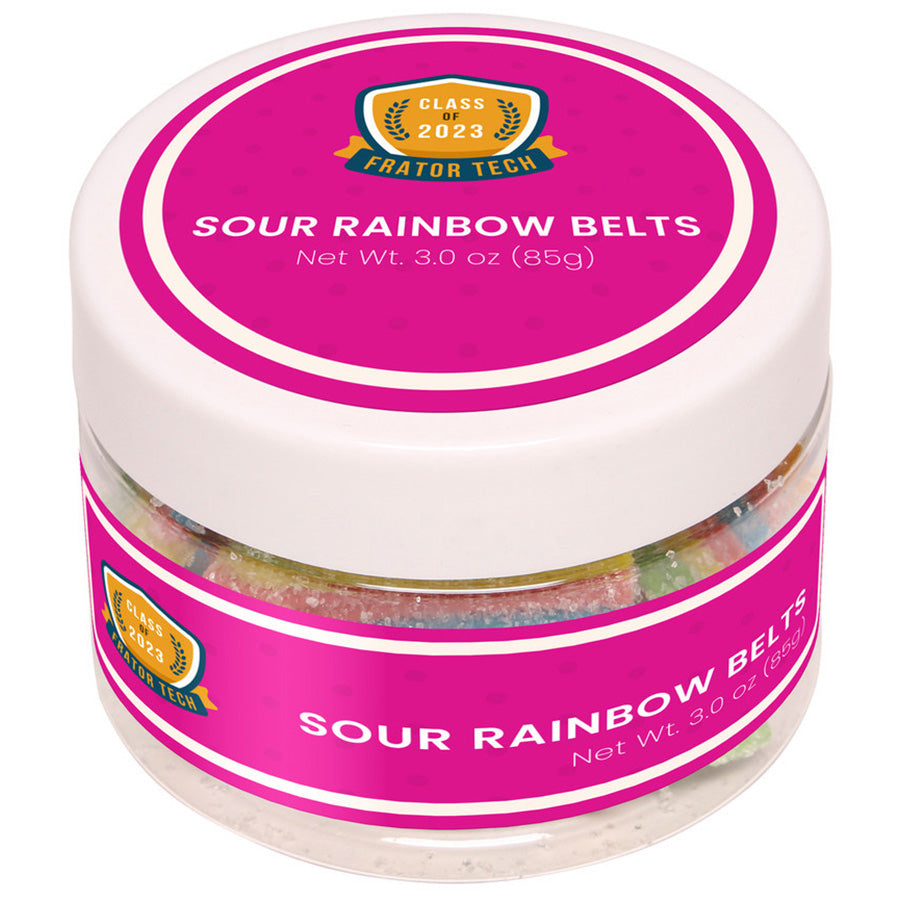 Design a custom logo for the SugarSpot Clear Sour Rainbow Belts: Small Jar to delight the taste buds. These rainbow sour snacks are fun and colorful, making them a wonderful addition to any party. Celebrate pride, a birthday, or a big event with a shock of flavor in a carriable jar. Place an order today to make sure your next event is on point.The minimum order for this product is 25 pieces.