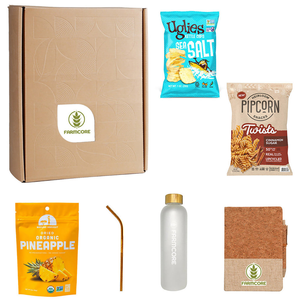 - Includes: Uglies Original Sea Salt Potato Chips (2 oz), Pipcorn Cinnamon Twists (1 oz), Mavuno Harvest Dried Organic Pineapple (2 oz), Stainless Steel Straw, Canton 1000 mL Glass Bottle with Bamboo Lid, Montado Cork and Linen Journ