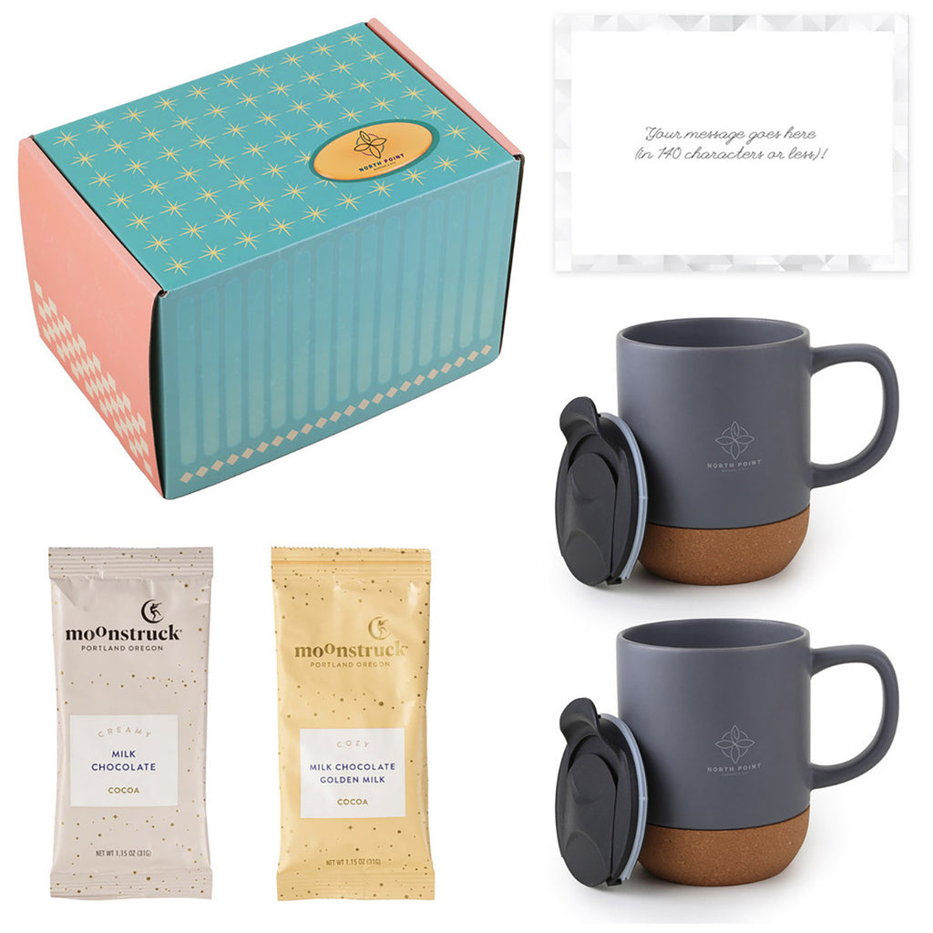 - Kit Contains: Two customizable Evora Cork Base Ceramic Mugs, Moonstruck Chocolate Co. Milk Chocolate Cocoa Single Serve Packet (1.15 oz), Milk Chocolate Golden Milk Cocoa Single Serve Packet (1.15 oz), and a customizable note card.