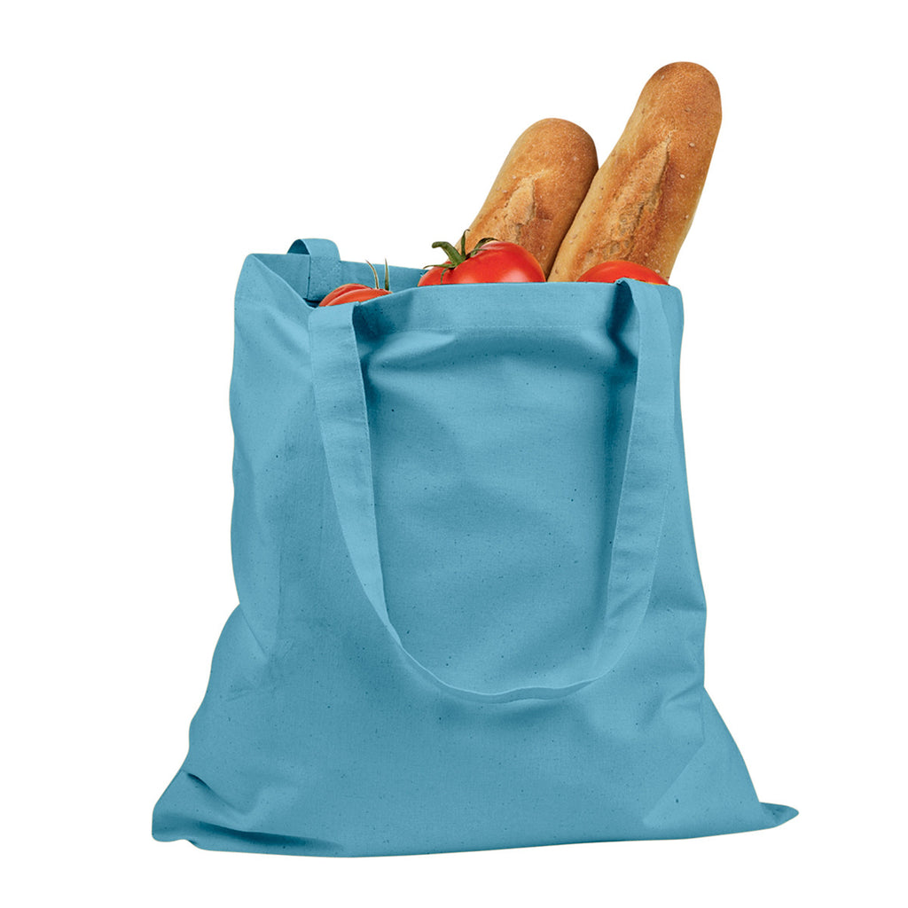 You might not think that a 100% cotton tote bag can handle the punishment inflicted on it at crowded airports. The 100% cotton BAGedge Sky Blue 6 oz Canvas Promo Tote bag resists the types of rips and tears that render other brand tote bags obsolete. Long carrying handles allow you to balance heavy loads against your hip to give you more movement flexibility in tight grocery store aisle. Place the toe on your right shoulder to grab a carton of milk out of the refrigeration unit and then quickly move the tote bag to the left shoulder to allow a customer to pass you by. Add a custom logo to promote your business to potential customers that shop at the same grocery and department stores.