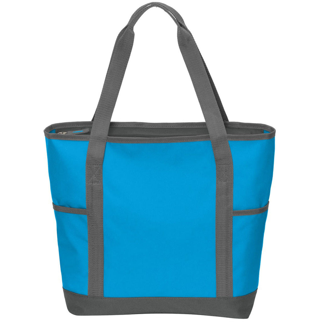 Logoed corporate accessories provide you with a cost effective way to get the word out about your company. However, no other corporate accessory makes more impact on your target market than the impact made by Port Authority Deep Aqua/Dark Charcoal On-The-Go Tote. The corporate accessories include over-the-shoulder length web handles for carrying heavy loads through crowded office corridors. Two end pockets store all of your electronic devices. The 600-denier polyester canvas absorbs the worst punishment, as well as prevents rips and tears from prematurely ending the lifespan of the totes. Unlike most totes, Port Authority totes zip up the main compartment to protect your most important business documents.Highlights