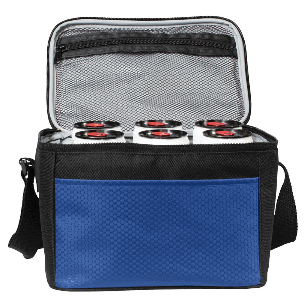 At nearly 400 cubic inches, the logoed Port Authority Twilight Blue/Black 6-Can Cube Cooler stores up to six cans of your favorite beverage. The denier honeycomb polyester cooler resists the rigors of frequent use during camping and backpacking trips. Adjust the web carrying strap to find the ideal way to balance the cooler weight on your shoulder. The heat-sealed, water-resistant lining ensures food remains fresh, even if your lunch hour starts later than expected. Interior zippered mesh pocket provides the best location for storing utensils for the next family picnic. Attach your corporate logo on the large imprint area to reach more potential customers,