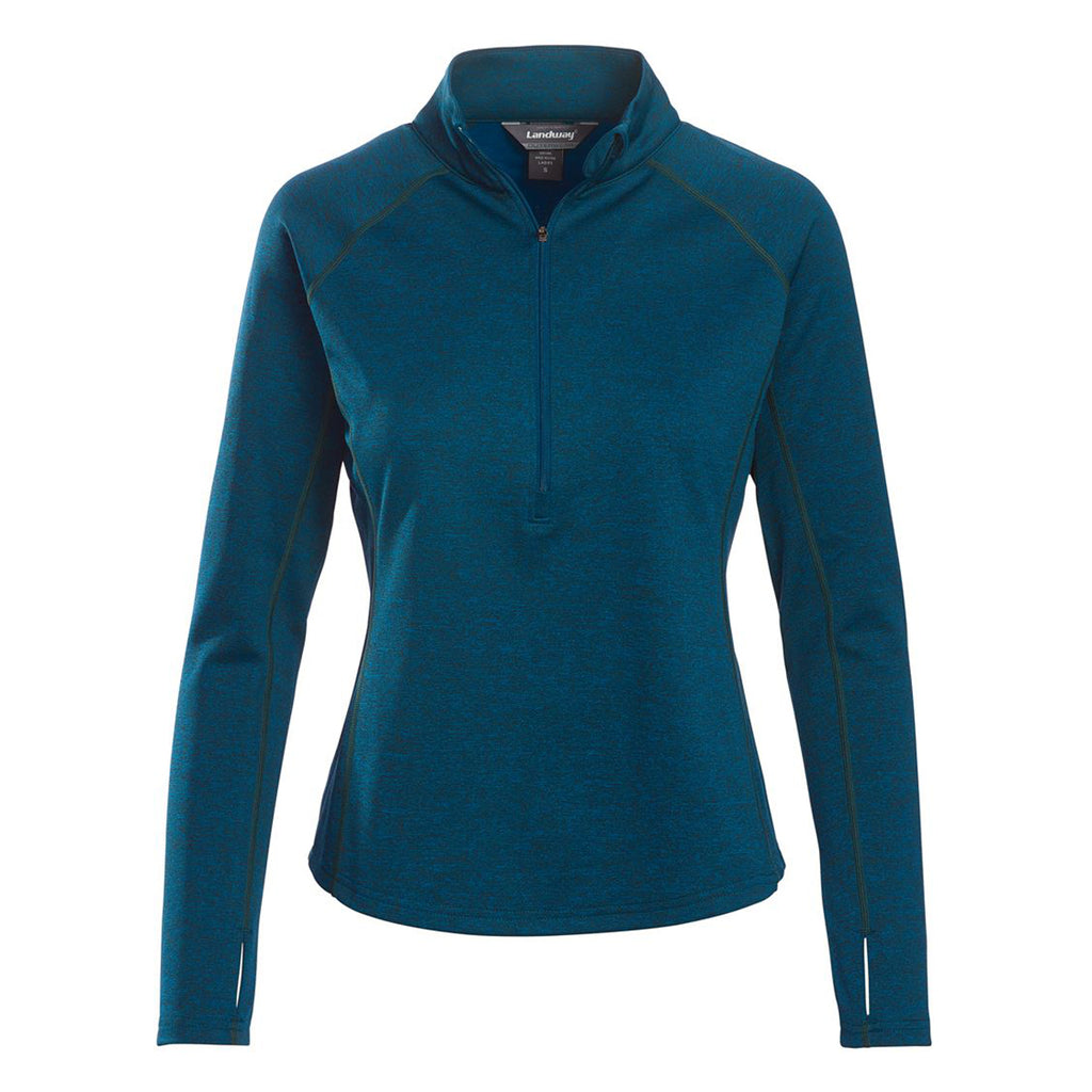 The corporate logo Landway Women's Heather Blue Alpha Heathered 1/4-Zip Pullover offers comfortable style in this must-have embroidery logo women's shirt. Available in four classic colors, this 1/4-zip pullover features a 100% yarn-dyed polyester melange fabric, an athletic fit, four-way stretch fabric, active dry moisture wicking fabric, flatlock stitching, raglan sleeves, and a reflective strip on the back yoke. By adding a company logo to the shirt, you are provided with an excellent gift option for upcoming golf events where your company sponsors the outing and provides the corporate-sponsored gifts at the end.Corresponding Men's Style: Landway Men's Heather Blue Alpha Heathered 1/4-Zip Pullover