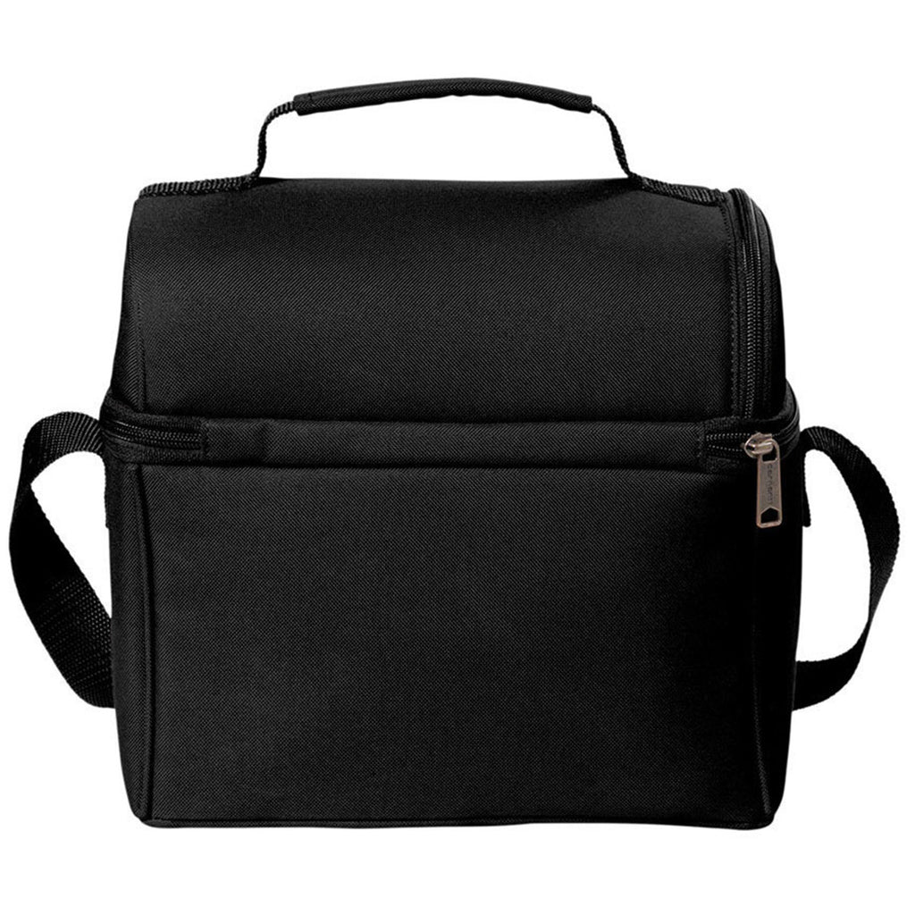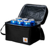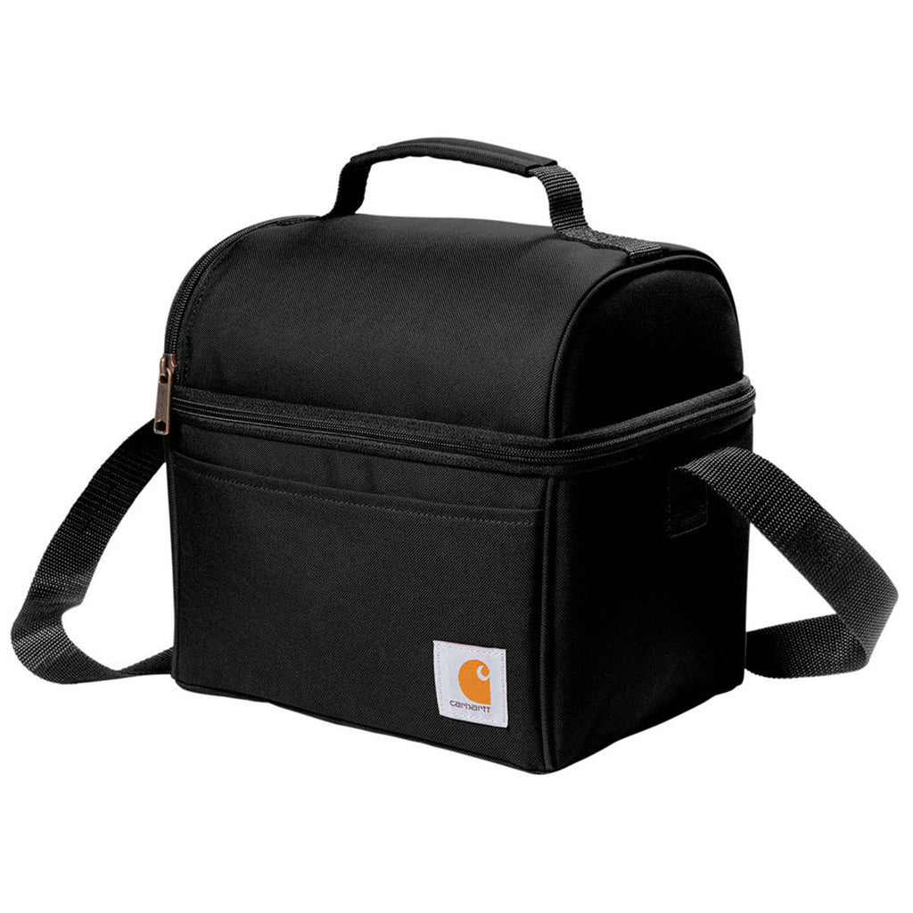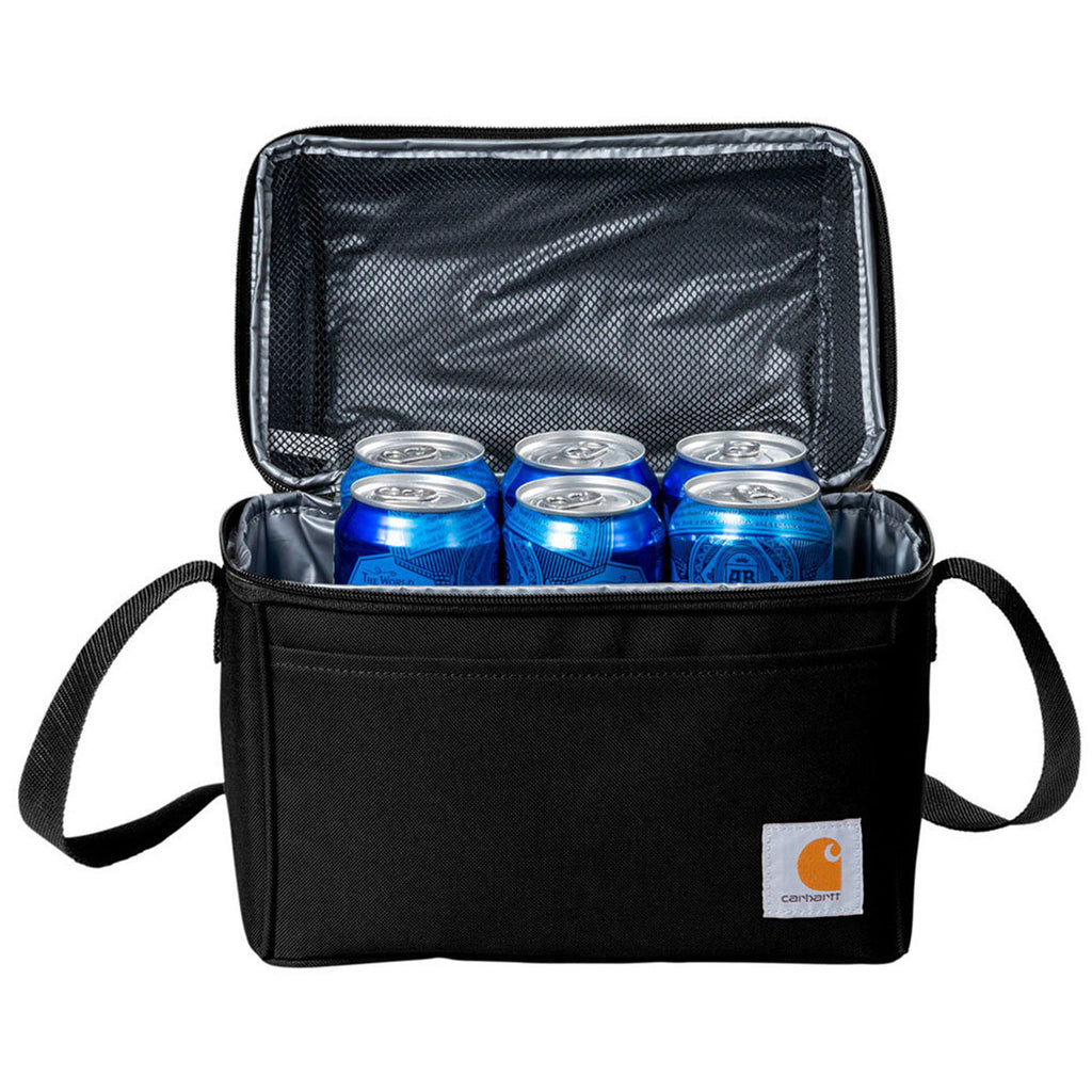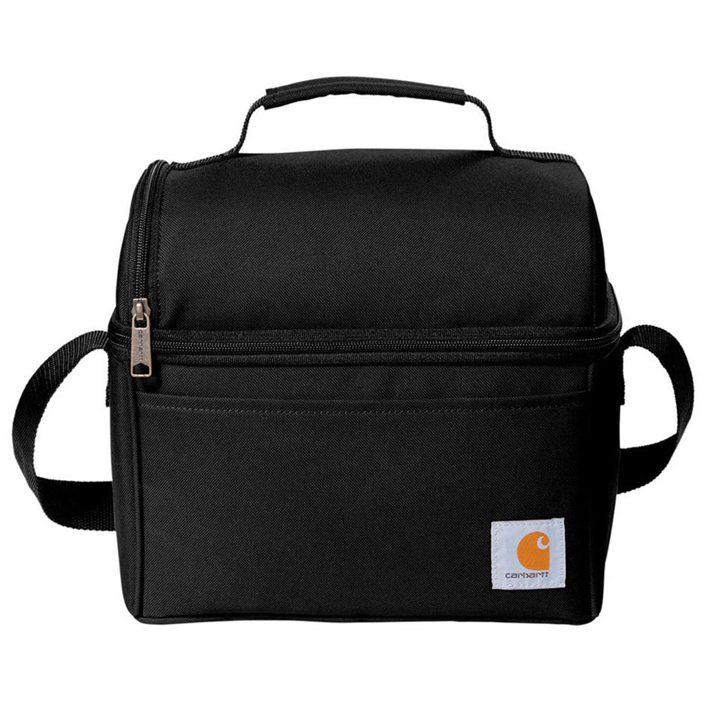 Add a company logo to the Carhartt Black Lunch 6-Can Cooler to make keeping drinks and snacks cool a breeze on the construction site or as you head out to adventure. The 600D polyester is up for whatever the day holds with a fully insulated main compartment with seam-sealed design to keep melting ice from leaking and a top compartment to keep food from being crushed. The large main compartment can hold up to 6 12-ounce cans and a front slash pocket it great for quick snacks. A shoulder strap and top handle make carrying a breeze. Perfect as employee gifts or to resale with a custom logo.