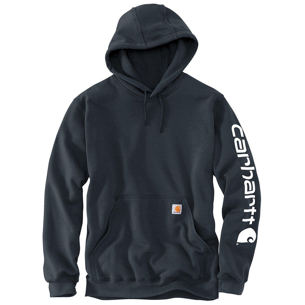 Carhartt Men's New Navy Midweight Hooded Logo Sweatshirt with a custom logo is the ultimate in athleisurewear. The layerable sweatshirt with front kangaroo pocket features the Carhartt logo along the left sleeve and is stretchable, triple-stitched, and loose-fitting. Great for working outdoors, working out, or lounging at home. Order today.