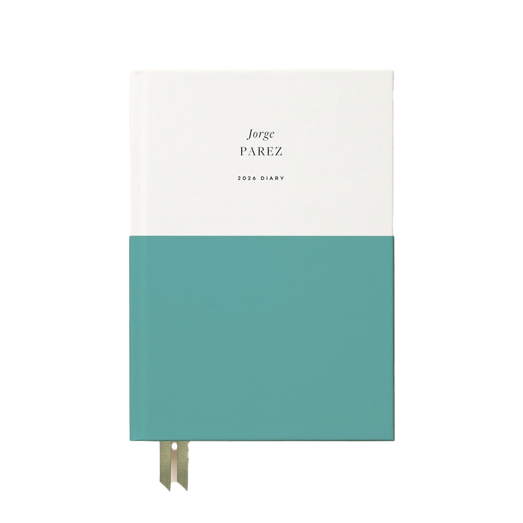 Papier Teal Demi Calendar Year Planner with a custom logo lets you see your month and year at a glance. This planner has a white top half and a colorful bottom half on the hardcover with an attached bookmark to keep your place. Start by setting monthly goals and then fill in each day. Perfect for students, busy parents, and those hard at work.