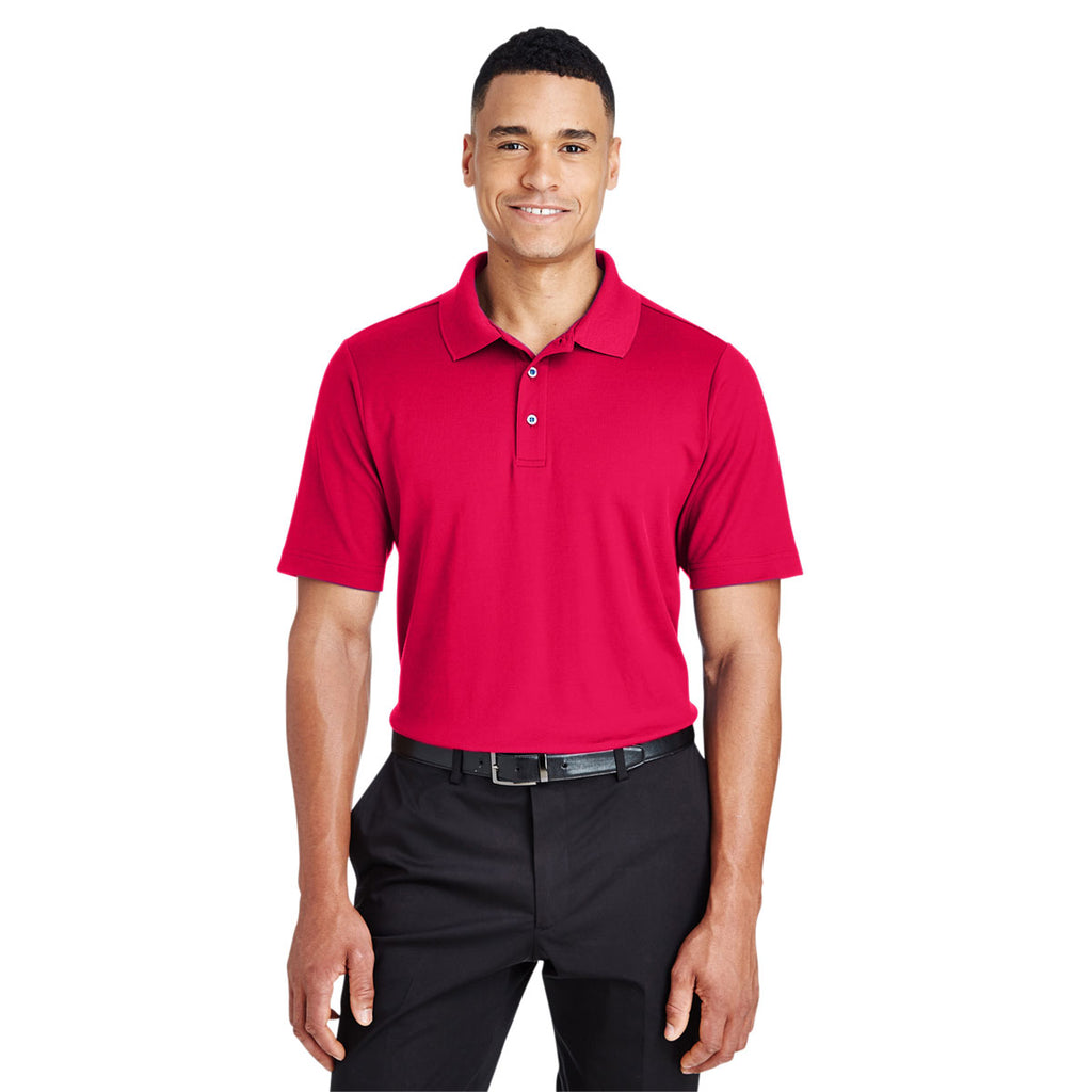 Before the next company golf outing, order the embroidered Devon & Jones Men's Red CrownLux Performance Polo for the male members of your team. The front of the stylish polo contains 100% durable polyester, while the back side enjoys a cotton and polyester blend to enhance comfort. Moisture wicking technology keeps the skin dry and cool throughout every round. The matching flat knit collar will attract the attention of fellow players. Take advantage of the attention by adding a custom logo on the large imprint area. Dyed-to-match buttons exude panache to make the polo your go to corporate apparel for outdoor recreational activities.Corresponding Women's Style: Devon & Jones Women's Red CrownLux Performance Polo