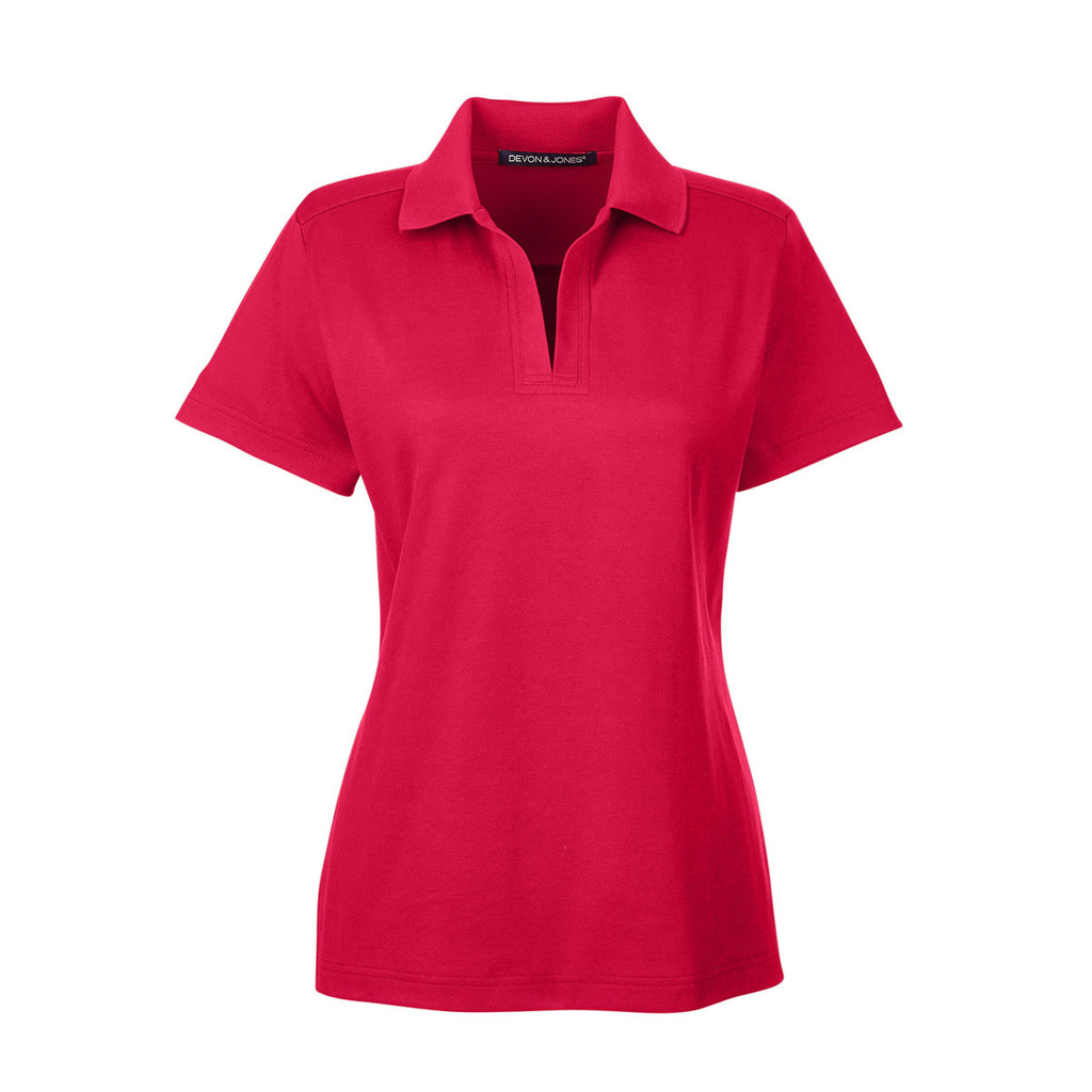 Before the next company golf outing, order the embroidered Devon & Jones Women's Red CrownLux Performance Polo for the members of your team. The front of the stylish polo contains 100% durable polyester, while the back side enjoys a cotton and polyester blend to enhance comfort. Moisture wicking technology keeps the skin dry and cool throughout every round. The matching flat knit collar will attract the attention of fellow players. Take advantage of the attention by adding a custom logo on the large imprint area. Luxury style and premium comfort make this polo your go to corporate apparel piece for your next company eventCorresponding Men's Style: Devon & Jones Men's Red CrownLux Performance Polo