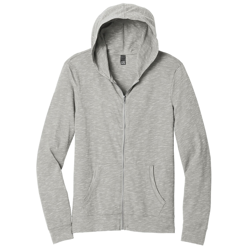 Turn employee appreciation day into a full fledge celebration by handing out the decorated District Men's Light Grey Medal Full-Zip Hoodie to the high achieving members of your corporate team. Designed to improve mobility, the hoodie is the right choice for active professionals that spend time working on home improvement projects. Super soft ring spun cotton feels smooth against the skin and a touch of polyester helps the fabric resist rips and tears. Self-fabric hem and cuffs exude panache to make your team stand out for all the right fashion reasons. Attach your company logo to shine the spotlight on your brand.Corresponding Women's Style:District Women's Light Grey Medal Full-Zip Hoodie