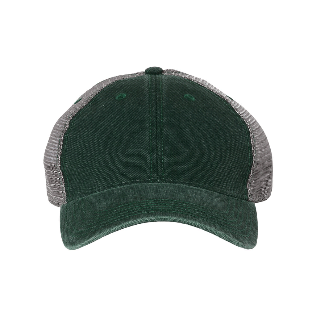 Go old school with embroidery on a Legacy Dark Green/ Grey Dashboard Trucker Cap. In true trucker cap style fashion, the cotton polyester front is completed by the washed canvas crown and mesh back. The worn in look adds flair to this traditional style with the pre-curved visor for impressive fit. Add a company logo to use as part of employee apparel or uniform wear or add a custom logo to create a unique gift or sales item. The unstructured, six-panel, low profile design is comfortable from day one in the one size fits most style with snapback closure for adjustment.