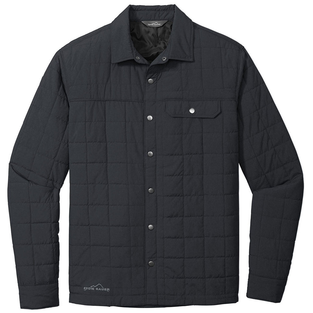Make a statement in a custom embroidered Eddie Bauer Men's Black Shirt Jacket made of 100% polyester fabric and fill. The midweight jacket is comfortable enough for daily wear, but stylish enough for a corporate event or retreat. Add a company logo or corporate emblem to use this jacket as part of company uniforms or as employee gifts. Complete with a snap front closure and snap cuffs, this jacket is well fitted and water resistant with a PU coating. The drop in left chest pocket will keep small items at hand as you go about your day.