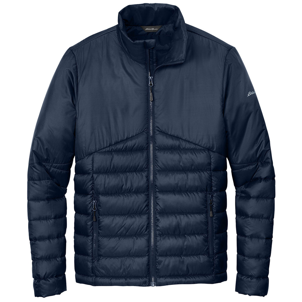 Eddie Bauer Men's River Blue Navy Quilted Jacket with a custom logo is ideal for those who work or play in the Great Outdoors. The quilted jacket is warm without being bulky and maximized to keep you warm while building snowmen, hitting a black diamond slope, or watching an outdoor game with friends. Place an order today.