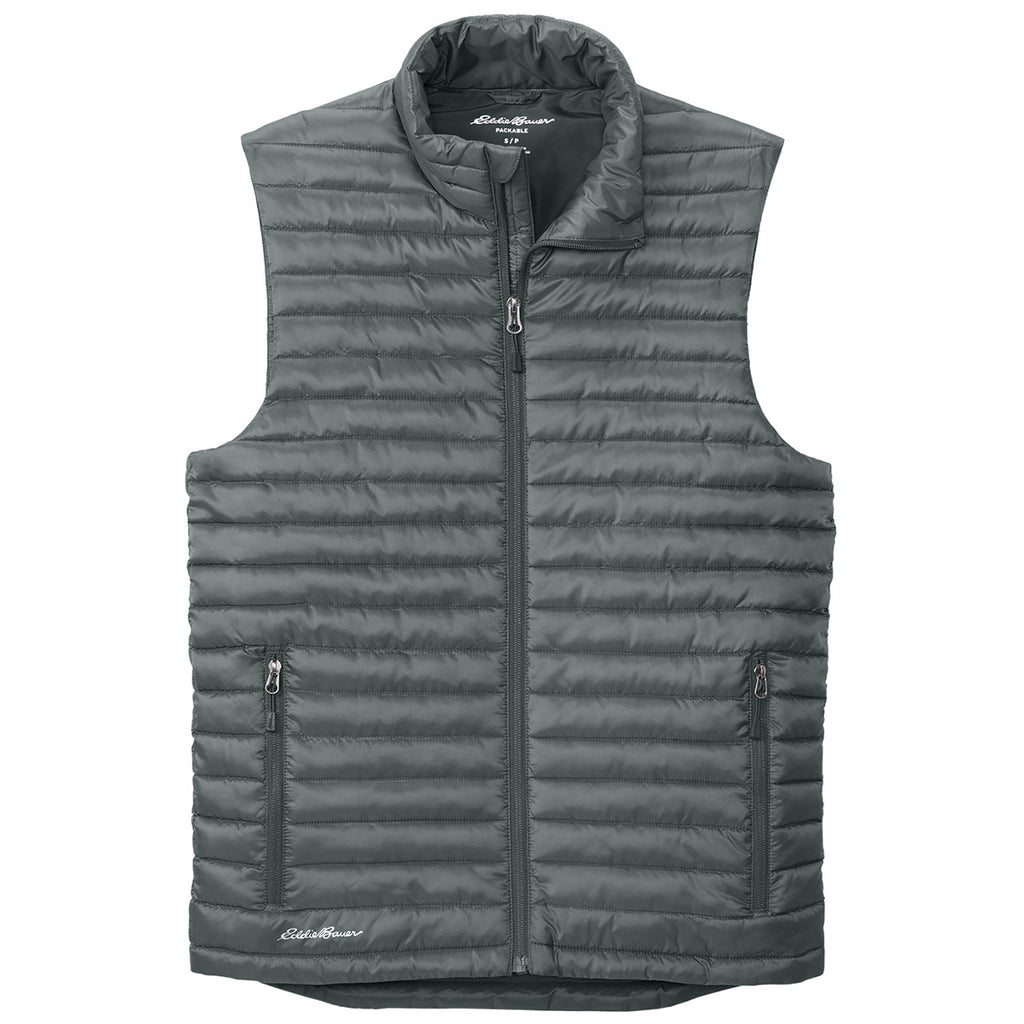 Eddie Bauer Men's Metal Grey Packable Quilted Vest with a custom design is a fun and functional way to stay toasty while enjoying the Great Outdoors. This packable vest can be worn and then easily packed away when it is no longer needed for the day. Perfect for hiking, camping, and hunting. Place an order right away.