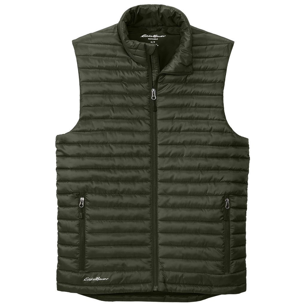 Eddie Bauer Men's Olive Green Packable Quilted Vest with a custom design is a fun and functional way to stay toasty while enjoying the Great Outdoors. This packable vest can be worn and then easily packed away when it is no longer needed for the day. Perfect for hiking, camping, and hunting. Place an order right away.