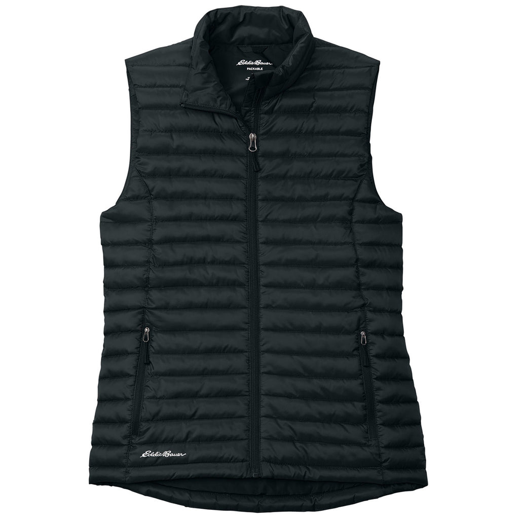 Eddie Bauer Women's Black Packable Quilted Vest with a custom logo is a must-have for the adventurers in your life. Made for warmth and weather-resistant performance, this vest packs into its own left pocket when not in use. Ideal for hiking, biking, jogging, and more. Place your order now before supplies run out.