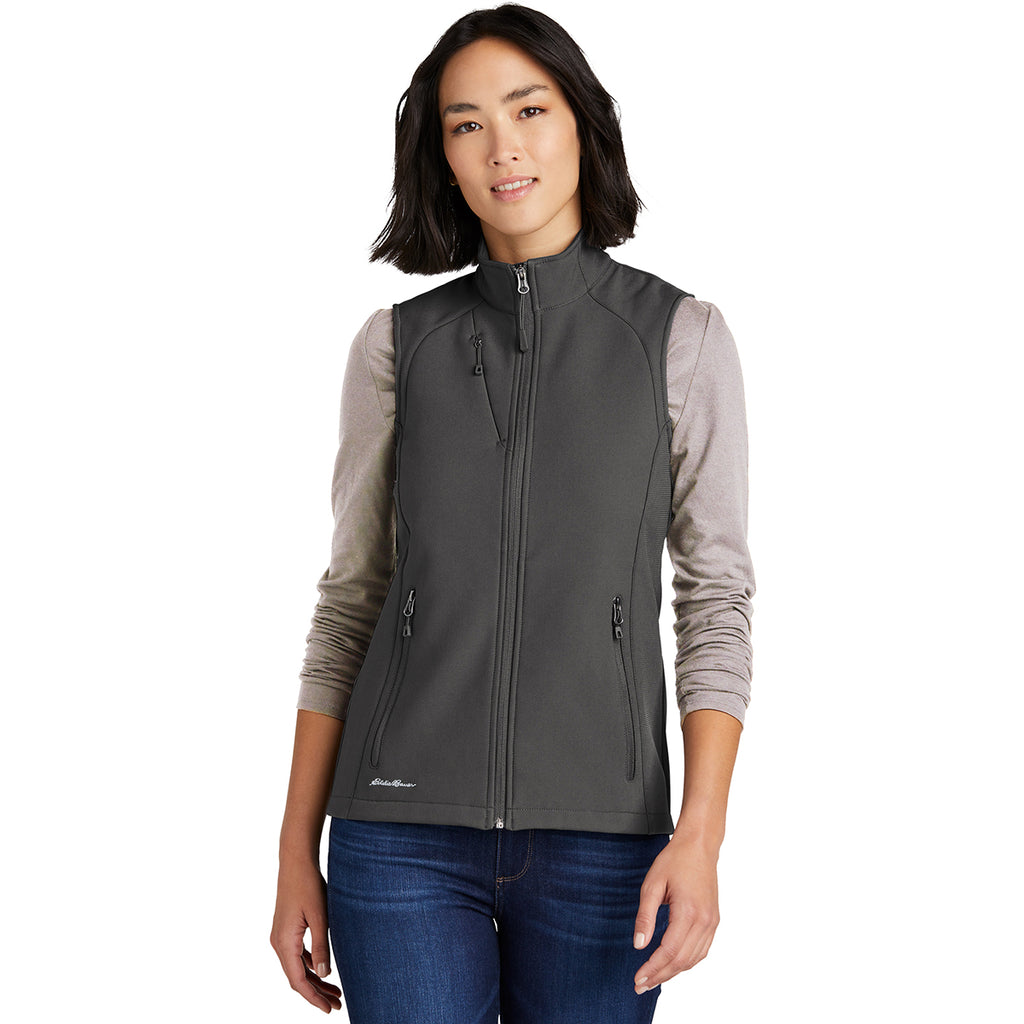 Order the Eddie Bauer Women's River Iron Grey Stretch Soft Shell Vest for extra warmth on a chilly night. Easily layer with any dress shirt for a professional corporate look. Fleece lining for a soft and comfortable fall day. Add a custom logo and broadly display your company's brand.