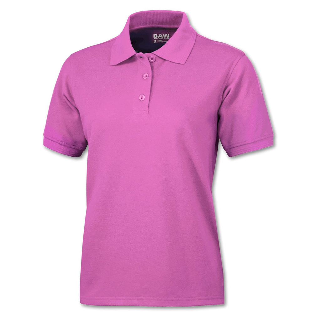 Perhaps you need to put your company's logo on a large number of polos, or maybe you just need an shirt with a more modest price. The BAW Women's Light Pink Everyday Polo is just that shirt. Your logo will look fantastic and the ladies who receive it will be very happy to include it in their casual wardrobe. This polo is made from cotton and polyester so it retains its shape and feels great in warm and cooler temps. It has all the traits of a traditional Polo half-moon yoke, extended tail and side vents. Brilliant colors from pink to gold and more are available in sizes XS to 3X.Highlights