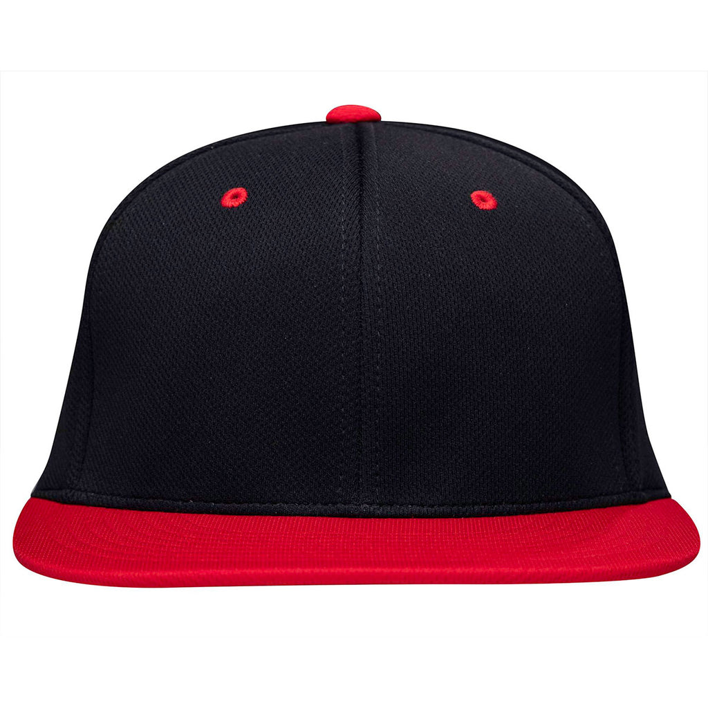 Turn heads with a custom embroidery Pacific Headwear Navy/Red Premium P-Tec FlexFit Cap made of performance fabric and completed with a pro-stitched finish. The base color is made bolder with contrast colored eyelets and flat visor. Add a company logo to use as part of employee apparel to get your employees noticed or give them as custom gifts to loyal customers. The graphite undervisor with shapeable visor conforms to what you want and moisture wicking makes it comfortable for all day wear, even in warmer environments. A closed back means this is a one size fits most design.Highlights