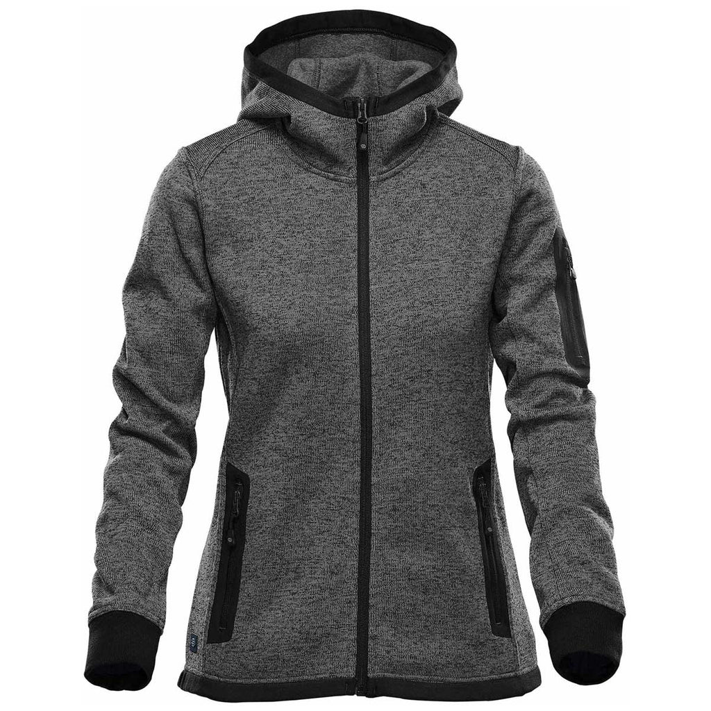 A custom hoody is a welcome addition to most clothing collections and the Stormtech Women's Graphite Juneau Knit Hoody is one of the best around. Be casual in this seriously comfortable hoody by Stormtech. Enjoy the great outdoors on an outdoor adventure or head to the lake with your family in the ultra-soft, sweater knit fleece hoody with a scuba hood and low profile. Store small essentials in the zippered hand-warmer pockets or keep your cold hands toasty. The perfect layer for cold days, this hoody can be embroidered with the design you choose and given as a high-end gift to those you care about.Corresponding Men's Style: Stormtech Men's Graphite Juneau Knit Hoody