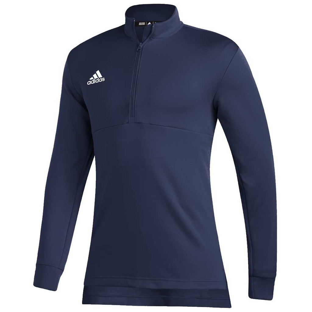 Feel great in a custom embroidery Adidas Men's Team Navy Blue/White Team Issue 1/4 Zip that is made to move. Made of recycled polyester and a polyester fleece blend this pullover sweatshirt quarter zip has moisture wicking technology to keep you comfortable whether worn alone of layered. The drop tail hem offers more coverage which is great when used as employee apparel with a company logo or simply added to your logoed apparel collection. Add a custom logo to use as part of team uniforms to maintain a cohesive look before and after the game.