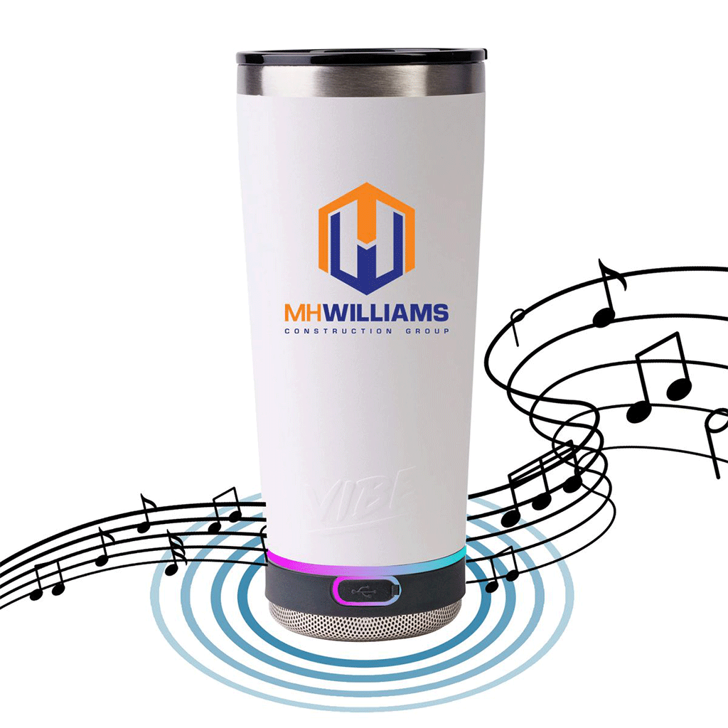 The Vibe White 18oz Speaker Tumbler keeps your beverage cool while playing your favorite tunes! This tumbler has an integrated Bluetooth speaker, double-wall stainless steel insulation and LED lights. Enjoy music for up to 8 hours while keeping your beverage cool for many more!The minimum order for this product is 24 pieces.