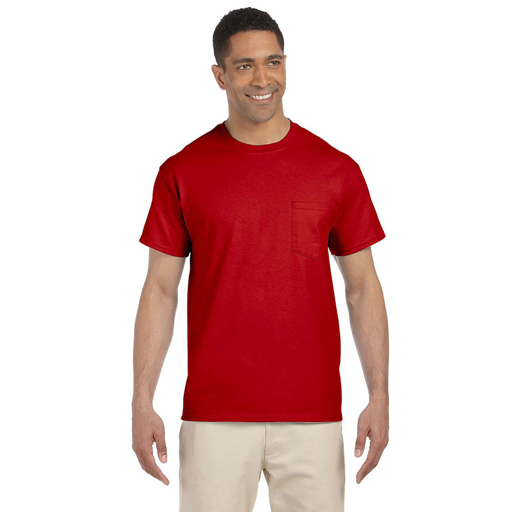 Welcome the newest members of your company team by handing out the versatile Gildan Unisex Red Ultra Cotton Pocket T-Shirt. With 100% preshrunk cotton fabric, your new employees will enjoy supreme comfort for years to come. The pocket short sleeve shirts work as standalone apparel, as well as the first layer under a button down dress shirt. The super soft t-shirt comes in safety green and safety orange to protect every employee that spends time outdoors working at night. Screen print your corporate logo to expand the presence of your company in the community.Highlights