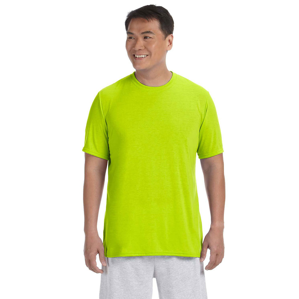 Take athletic performance to the next level by ordering the screen printed Gildan Men's Safety Green Performance T-Shirt for every employee on your high achieving team. Even the employees that prefer to root for the corporate softball team deserve to wear the lightweight, multi-purpose short sleeve shirts. Snag resistant fabric prevents the t-shirt from scrunching up whenever a player slides into second base. Designed with 100% polyester jersey knit, the stylish short sleeve shirt will get the other team talking about your incredible taste in fashion. Print a custom logo to take advantage of all the attention.Highlights