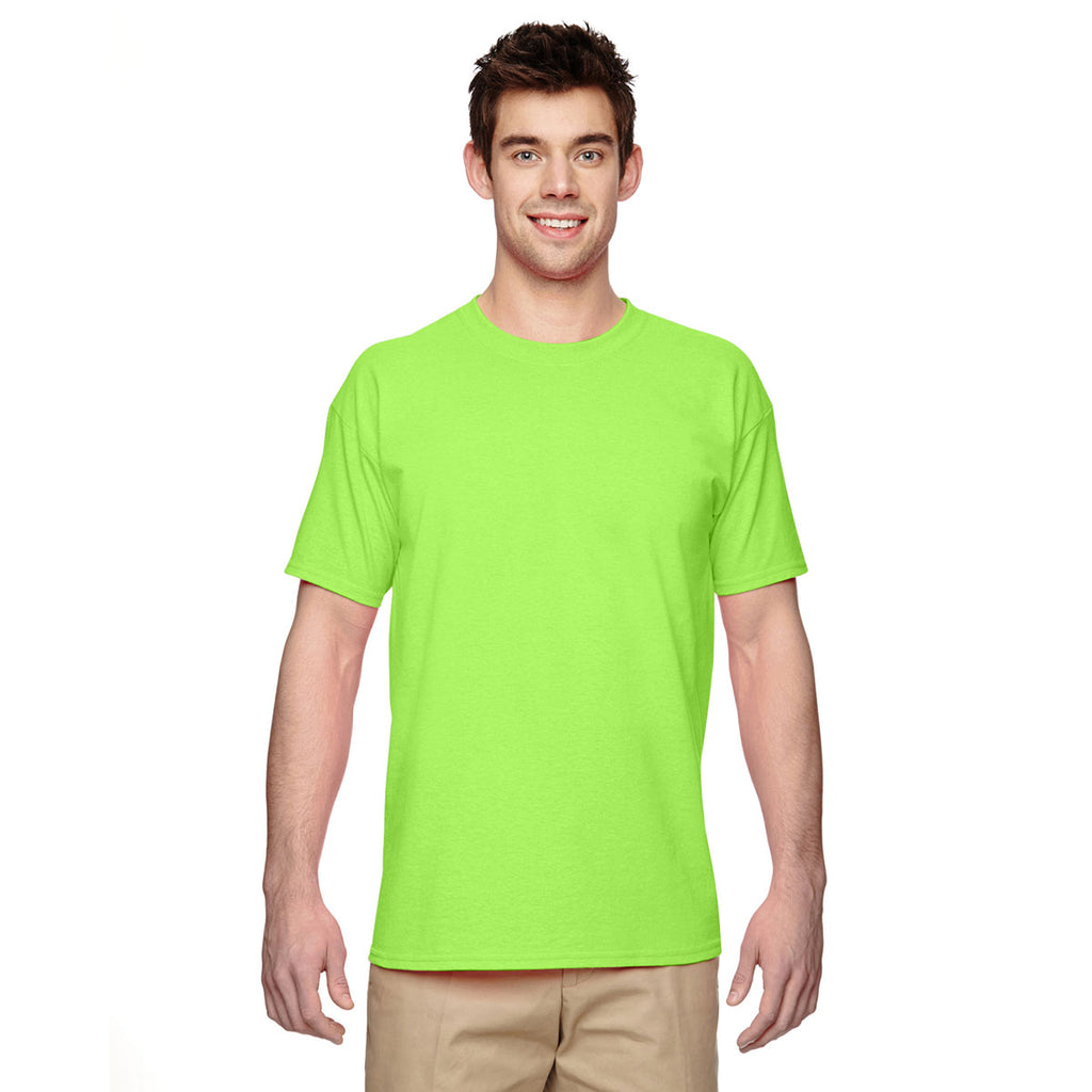 As the ideal gift for participants at golf events and 5k races, the logoed Gildan Men's Neon Green 5.3 oz. T-Shirt features a stylish rib at the neckline to achieve company fashion greatness. The classic fit makes the t-shirt a welcome addition for any professional that wants apparel flexibility at work and play. Super soft 100% preshrunk cotton delivers supreme comfort to keep you feeling fresh all day long. Double needle stitching prevents rips and tears to give you go to short sleeve shirts for years to come. Screen print a custom logo on the t-shirt to reach more potential customers at outdoor civic events.Corresponding Women's Style: Gildan Women's Neon Green 5.3 oz. T-Shirt