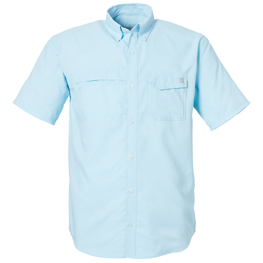 Create a corporate logo for the HUK Men's Crystal Blue Tide Point Short Sleeve Shirt to create a look to give to employees or share with clients. This short-sleeve button-up is durable, breathable, and comfortable for daily wear. Great for those who work outdoors, visit customer homes, or simply love the outdoors.Highlights