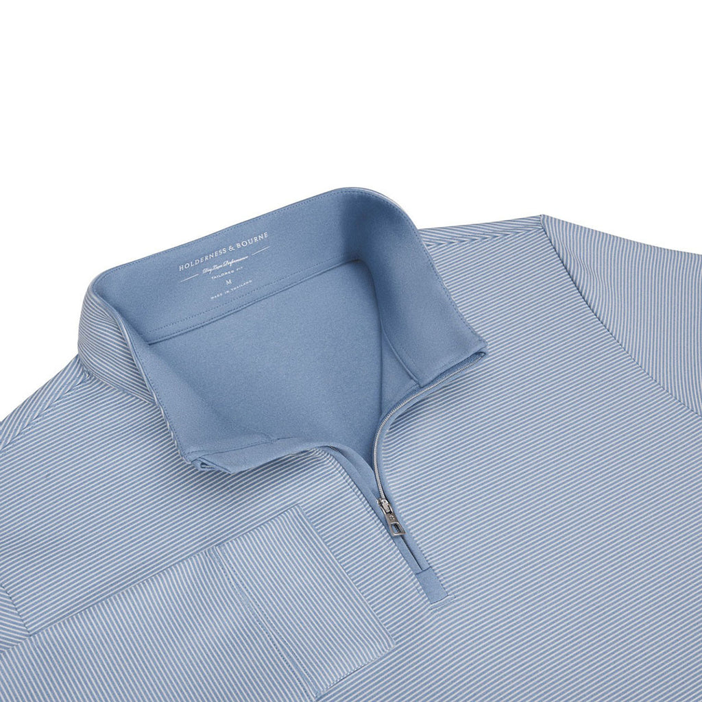 Custom-designed for performance and polish, the Holderness & Bourne Men's Bedford & White The Sherwood Pullover in deep teal and white combines a modern quarter-zip silhouette with breathable stretch fabric. The bold contrast chest stripe offers elevated visual appeal. At the same time, the tailored fit ensures comfort from tee time to post-round gatherings. It's a smart mid-layer with a standout style.Highlights