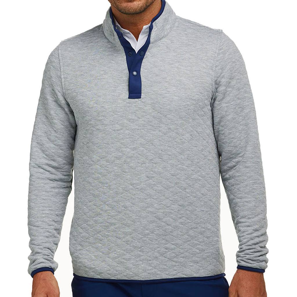 Corporate layering gets a refined upgrade with the Holderness & Bourne Men's Heathered Grey & Navy The Sullivan Pullover in heathered navy. This pullover is made from performance fleece and delivers lightweight warmth, stretch, and structure without bulk. The sleek design transitions easily from the course to casual Friday, making it a staple for cool-weather comfort and effortless professionalism.Highlights