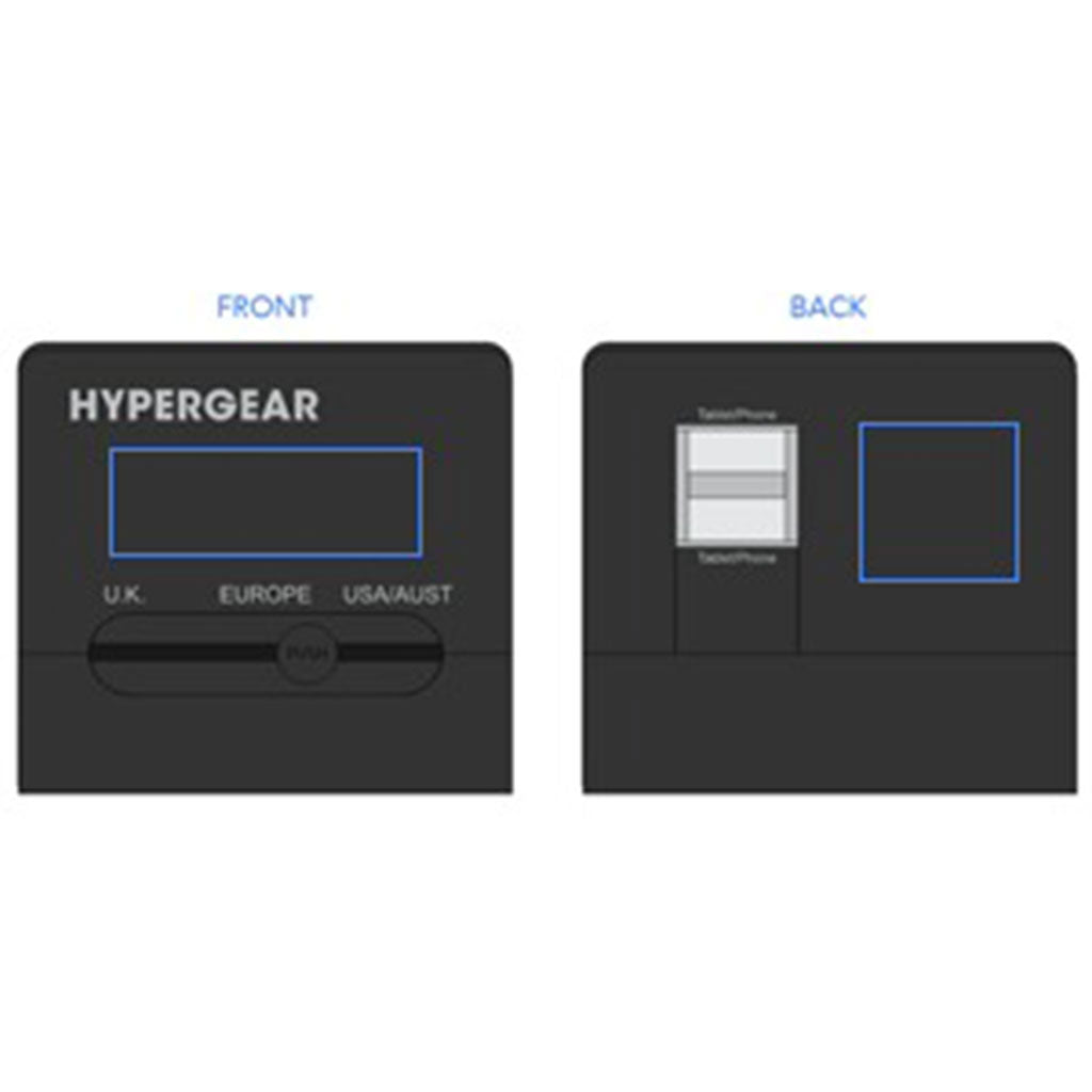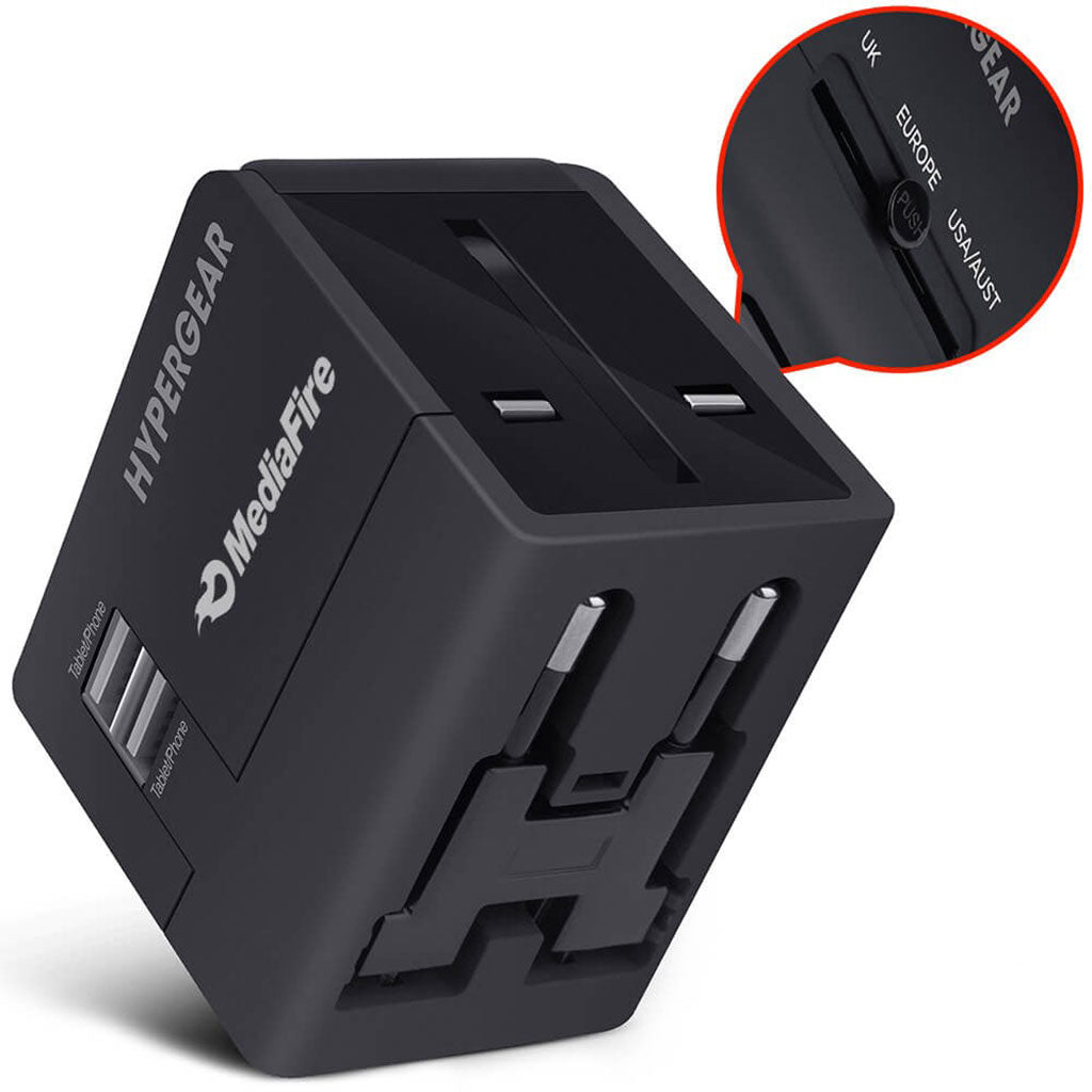 Choose a custom design for the HyperGear Black All-In-One World Travel Adapter to have the ultimate travel companion. Easily charge three USB devices at the same time with this charger that works in over 150 countries due to the rectangular prongs. Great for traveling overseas, for work, and vacation.