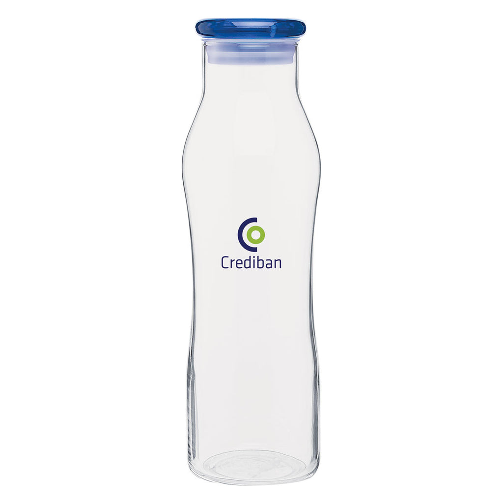 This single wall glass bottle is no-frills in real terms! It's a sleek, curvy, and minimal container to store fluids. With a push-on lid and 20-oz capacity, this H2Go Blue Vue Glass Bottle 20 oz is ideal for on-the-go or indoor use. Personalize it with a logo imprint for your brand.