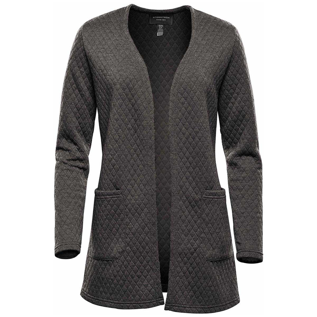 Show your custom style with the Stormtech Women's Graphite Heather Chelsea Open Cardigan. Add a company logo to the versatile cardigan to use as employee apparel or to offer an option in cold weather. The 3/4 length cardigan is on trend with the urban scene, but highly functional when it comes to warmth. The quilted pattern with side pouch pockets add to both form and functionality in this open cardigan that will be an instant hit.