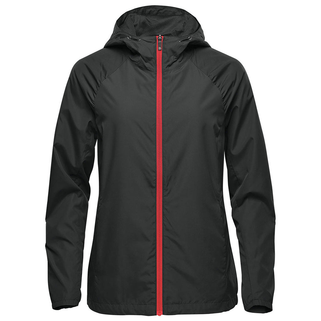 A custom embroidery on the Stormtech Women's Black/Bright Red Pacifica Jacket will create a custom gift that others will truly appreciate. This full front zip jacket is urban inspired and outdoor ready. The ultra-lightweight wind jacket provides a sleek, somewhat fitted silhouette with back mesh lined vent to keep you comfortable. Articulated elbows allow for freedom of movement and an attached hood keeps you protected during pop-up showers. The beautiful jacket has a simplistic design, but is perfect for a range of situations. Add a company logo to use as part of employee uniforms for those who have to work outdoors, but need to be able to move freely. Place an order today for these versatile jackets.Highlights