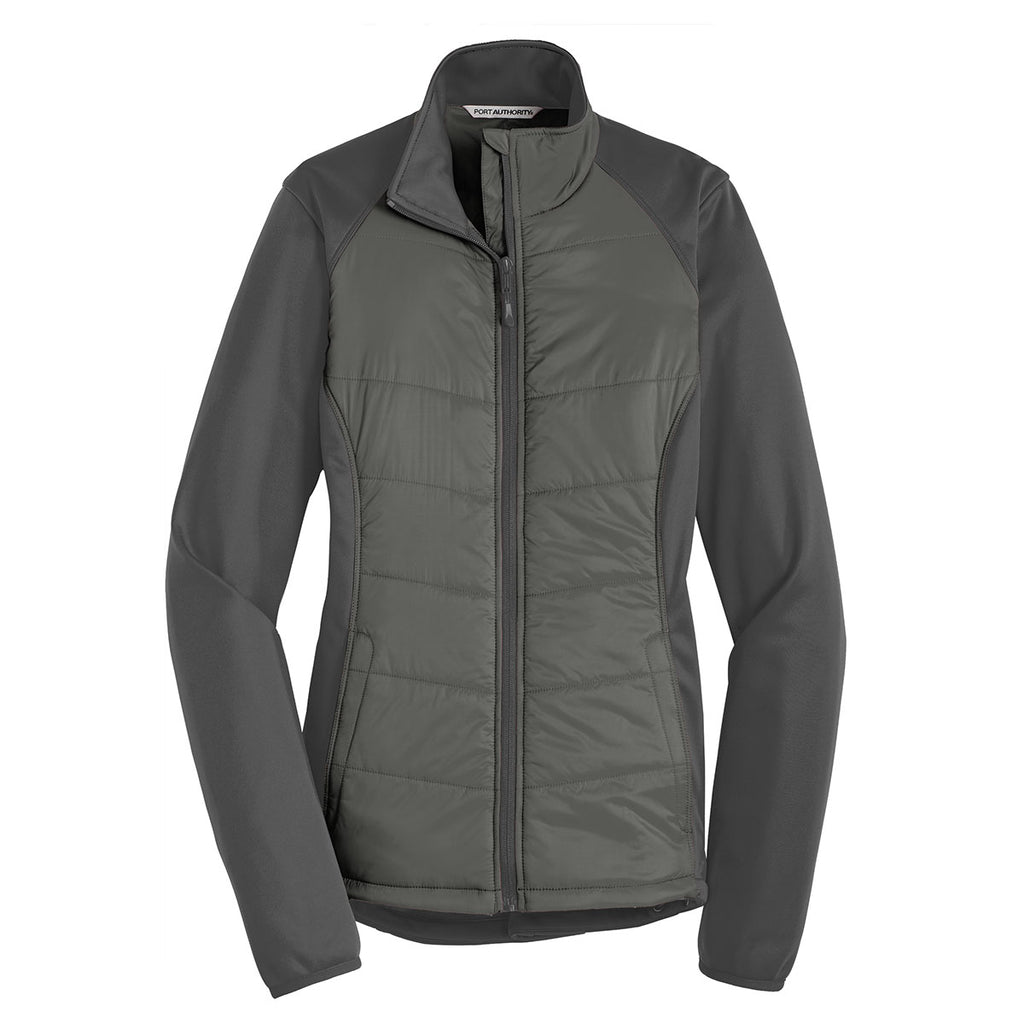 Mother Nature can make the walk from your car to the office a drenching mess. A sudden downpour can turn an enjoyable hike into a soggy disaster. The Port Authority Women's Smoke Grey/Grey Steel Hybrid Soft Shell Jacket contains a 100% polyester knit shell attached to a waterproof film insert that keeps you dry in the worst weather conditions. Quilted front and back panels contrast nicely with the rugged shell to produce an urbane looking jacket. This jacket makes the ideal gift for members of your team on employee appreciation day. Just remember to attach your corporate logo to create a cost effective way to promote your company.Corresponding Men's Style: Port Authority Men's Smoke Grey/Grey Steel Hybrid Soft Shell Jacket