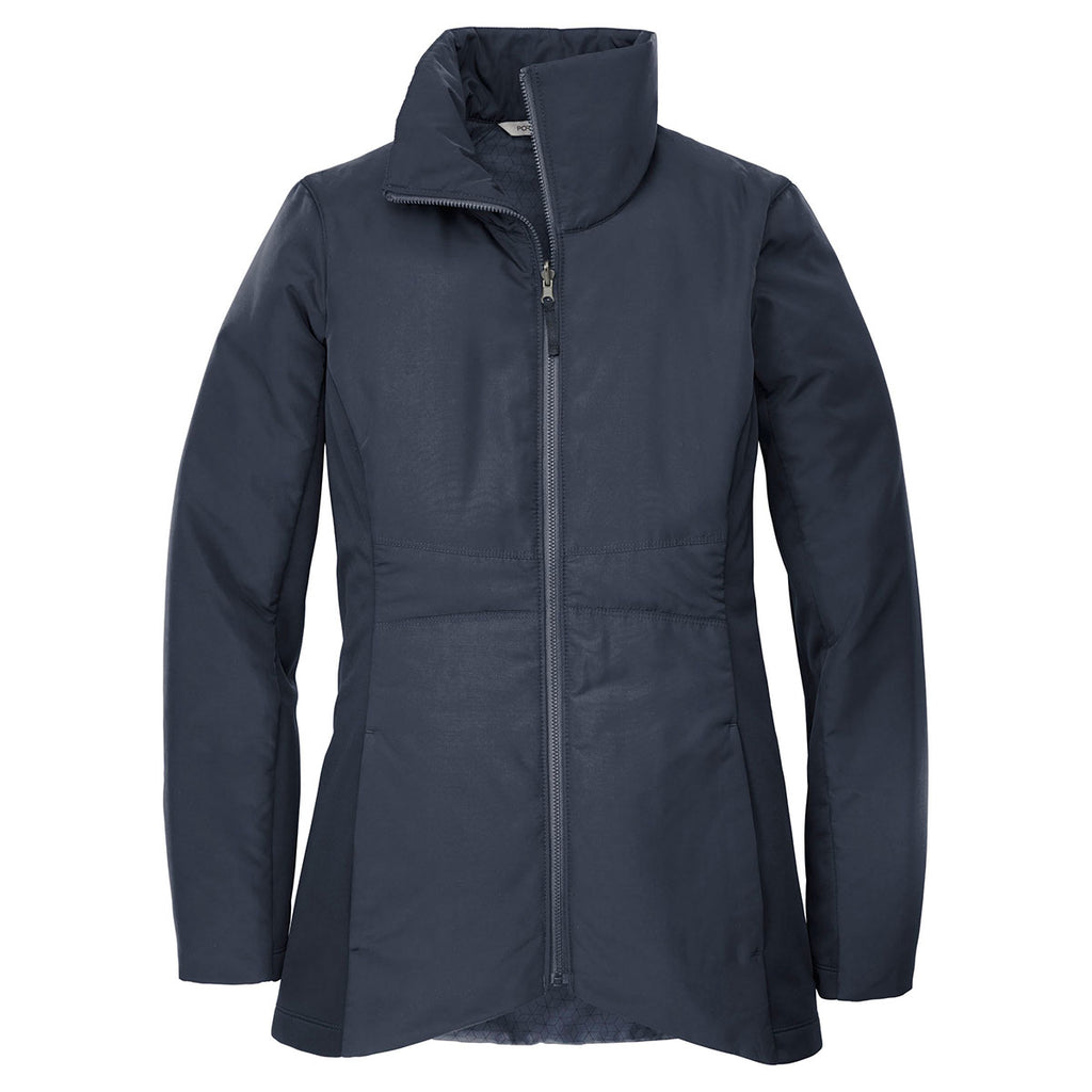 As hybrid corporate apparel, the multi-purpose Port Authority Women's River Blue Collective Insulated Jacket combines the warmth of low-bulk quilted insulation with flexible soft shell side panels to present a look your peers will envy at business seminars. The rugged 100% polyester shell resists rips and tears to make the jacket ideal for weekend backpacking treks with the members of your corporate team. Attach a custom logo on the large imprint area to shine the spotlight on your company. Waterproof film insert prevents moisture from prematurely ending a fun day spent out in the wild.Corresponding Men's Style: Port Authority Men's River Blue Collective Insulated Jacket