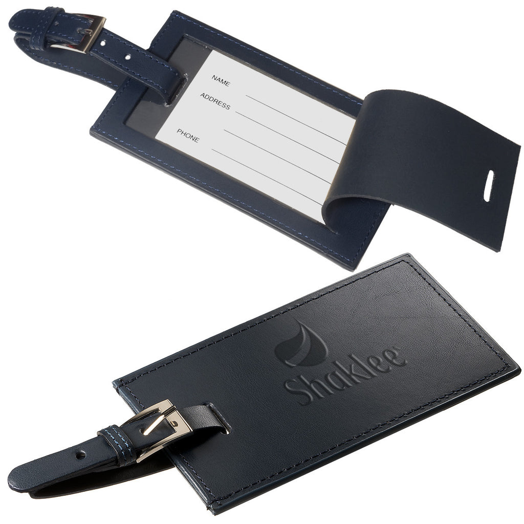 With an adjustable strap and silver-tone buckle, the Leeman Navy Whitney Luggage Tag helps you retrieve your quickly at airport baggage claims. strong bonded leather resists types of rips tears that cause other tags to disconnect from backpacks suitcases duffel bags. has added a secures backside flap prevent anyone reading personal information. wide by long deboss imprint area make perfect spot add company logo. what better opportunity will have promote brand than busy terminals concourses>